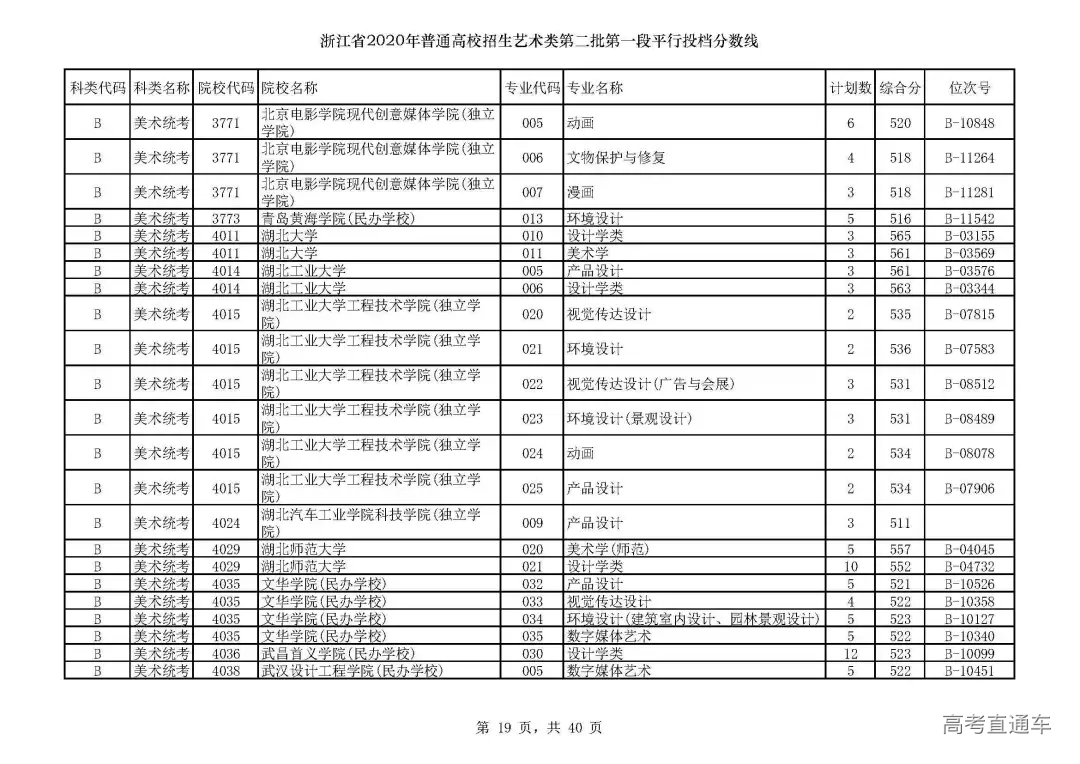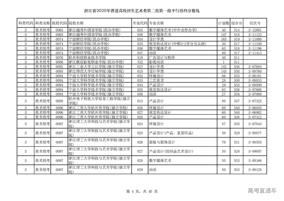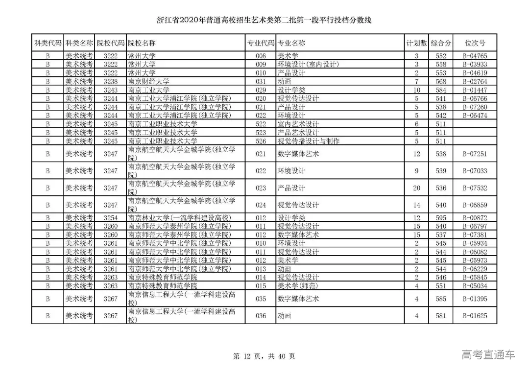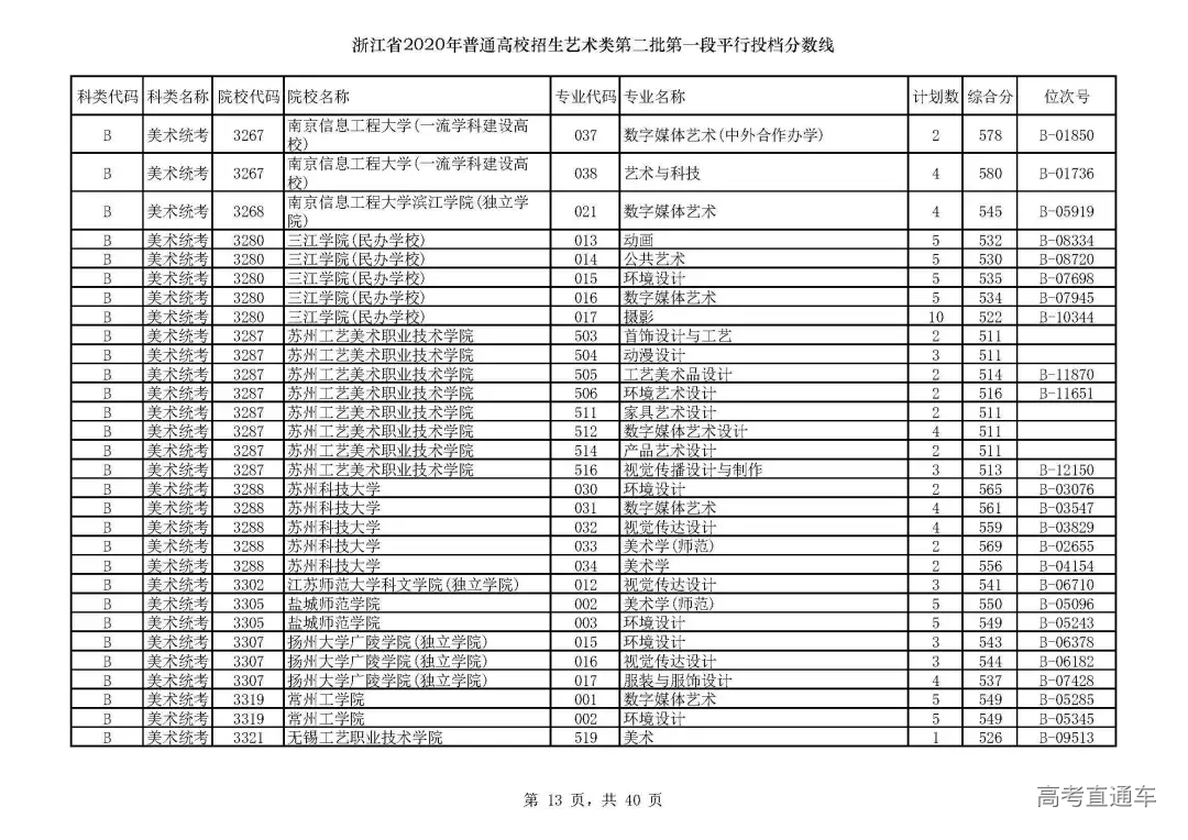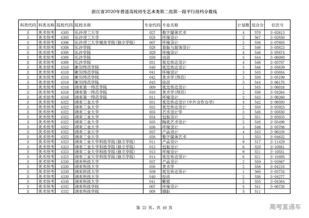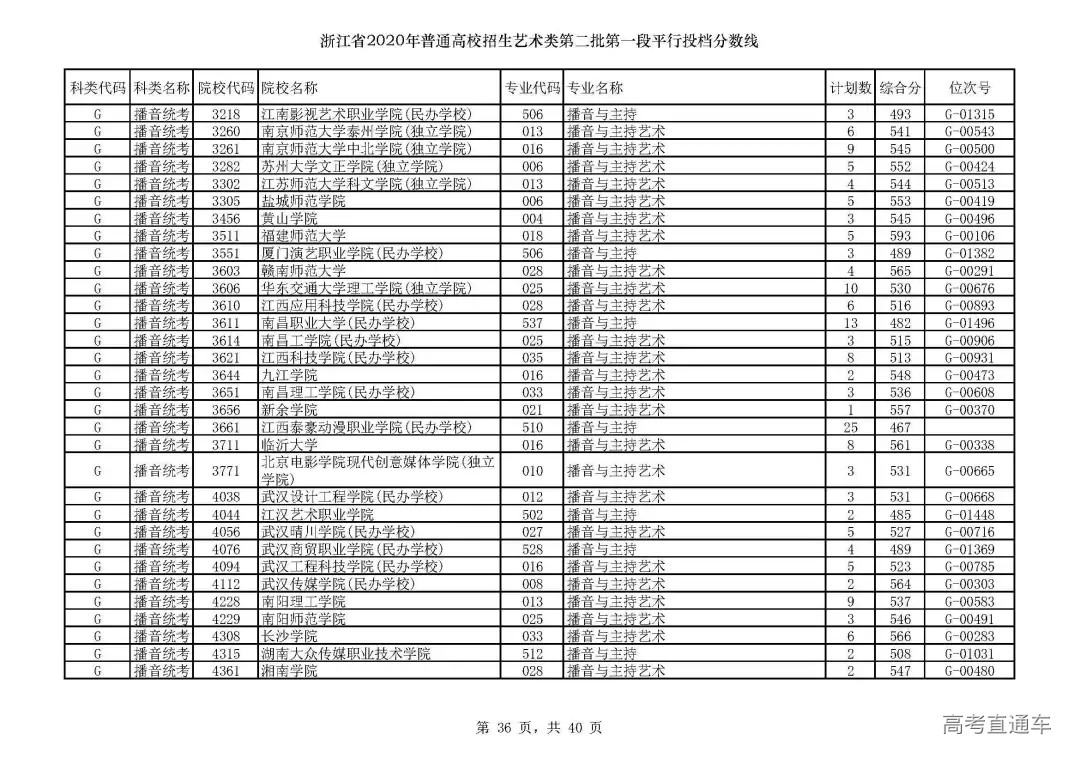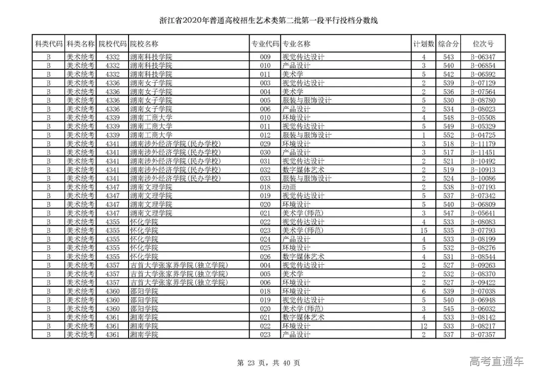 浙江省2020年艺术类第二批第一段平行投档分数线