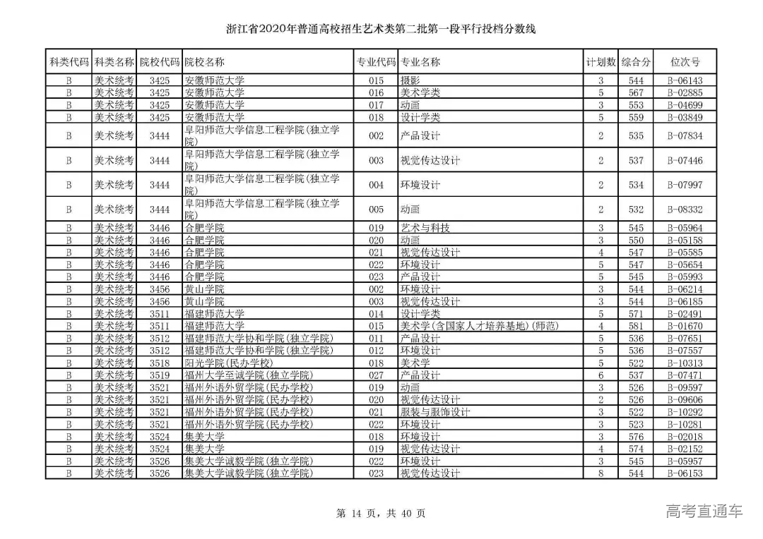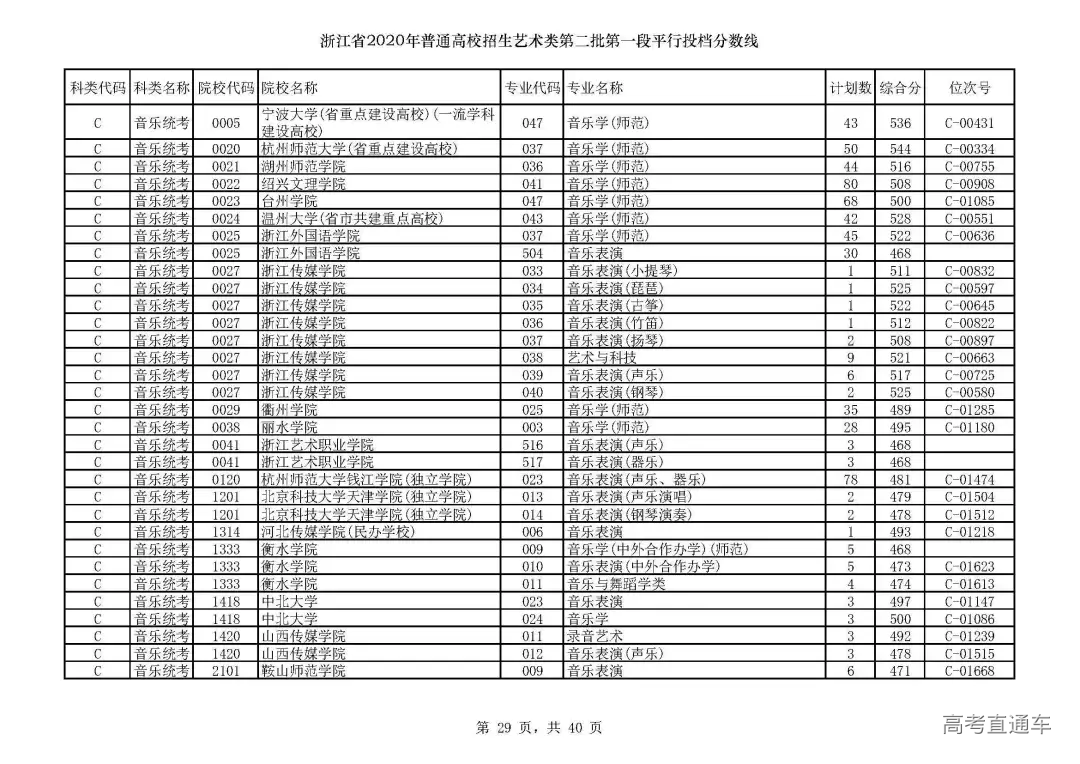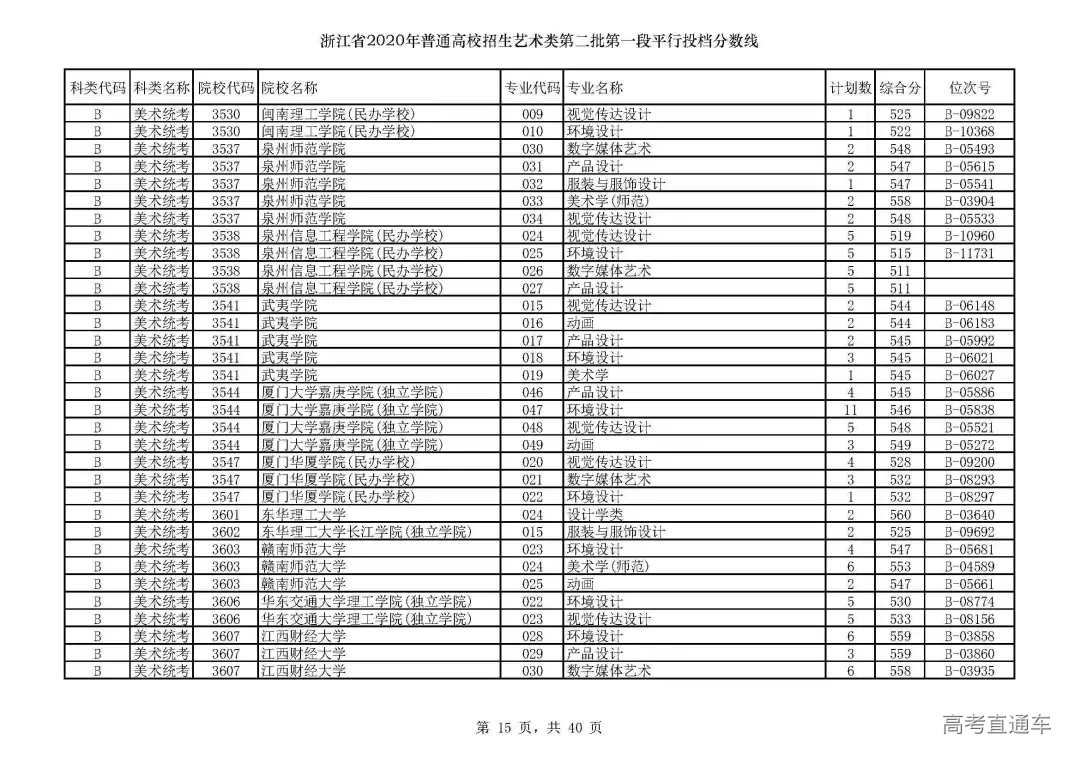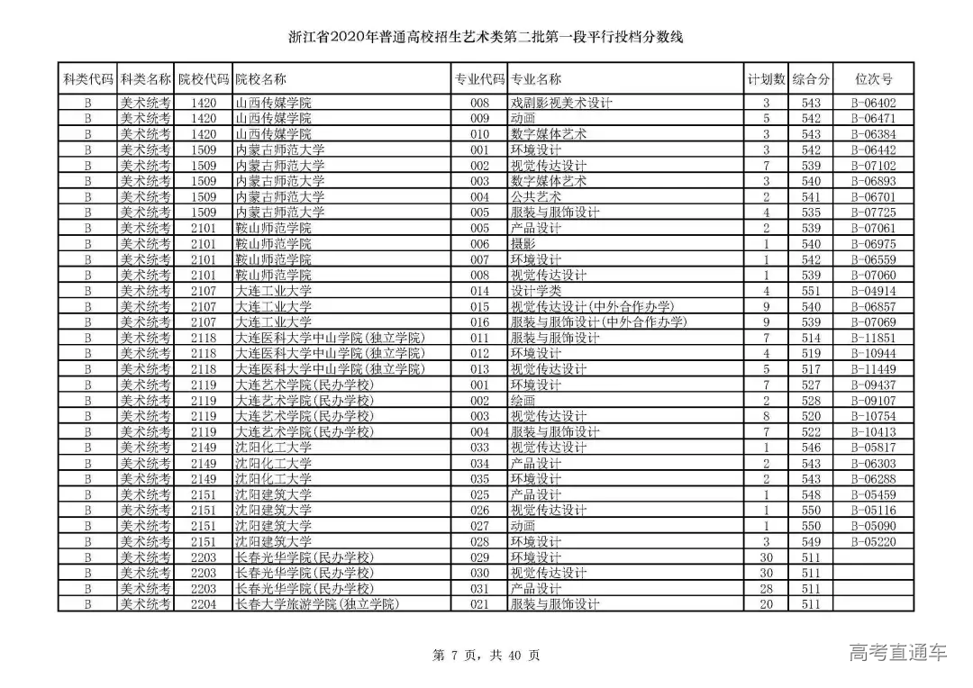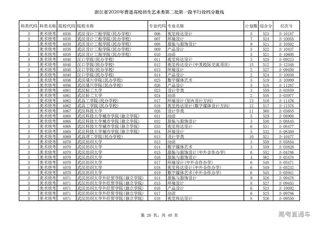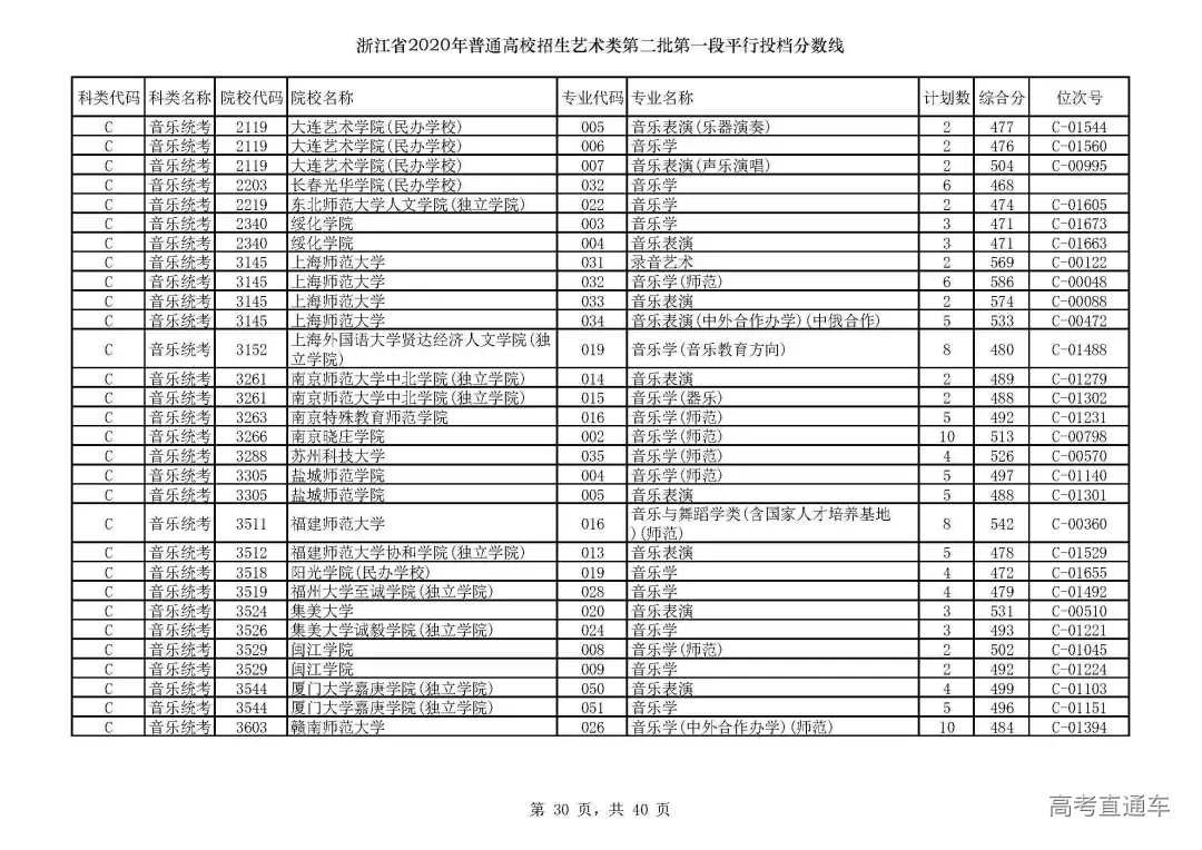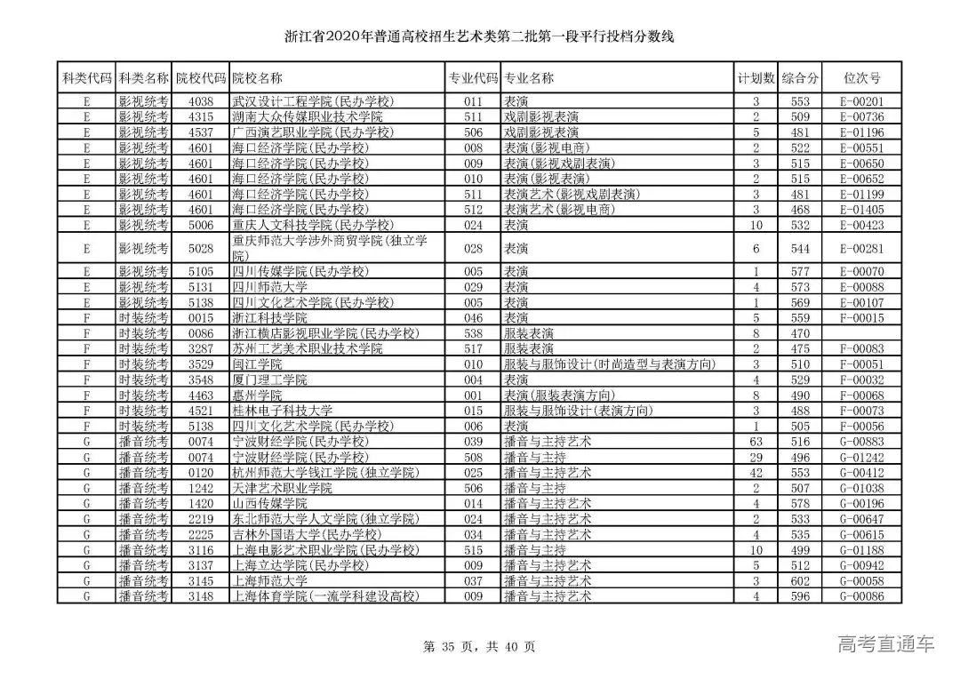 浙江省2020年艺术类第二批第一段平行投档分数线