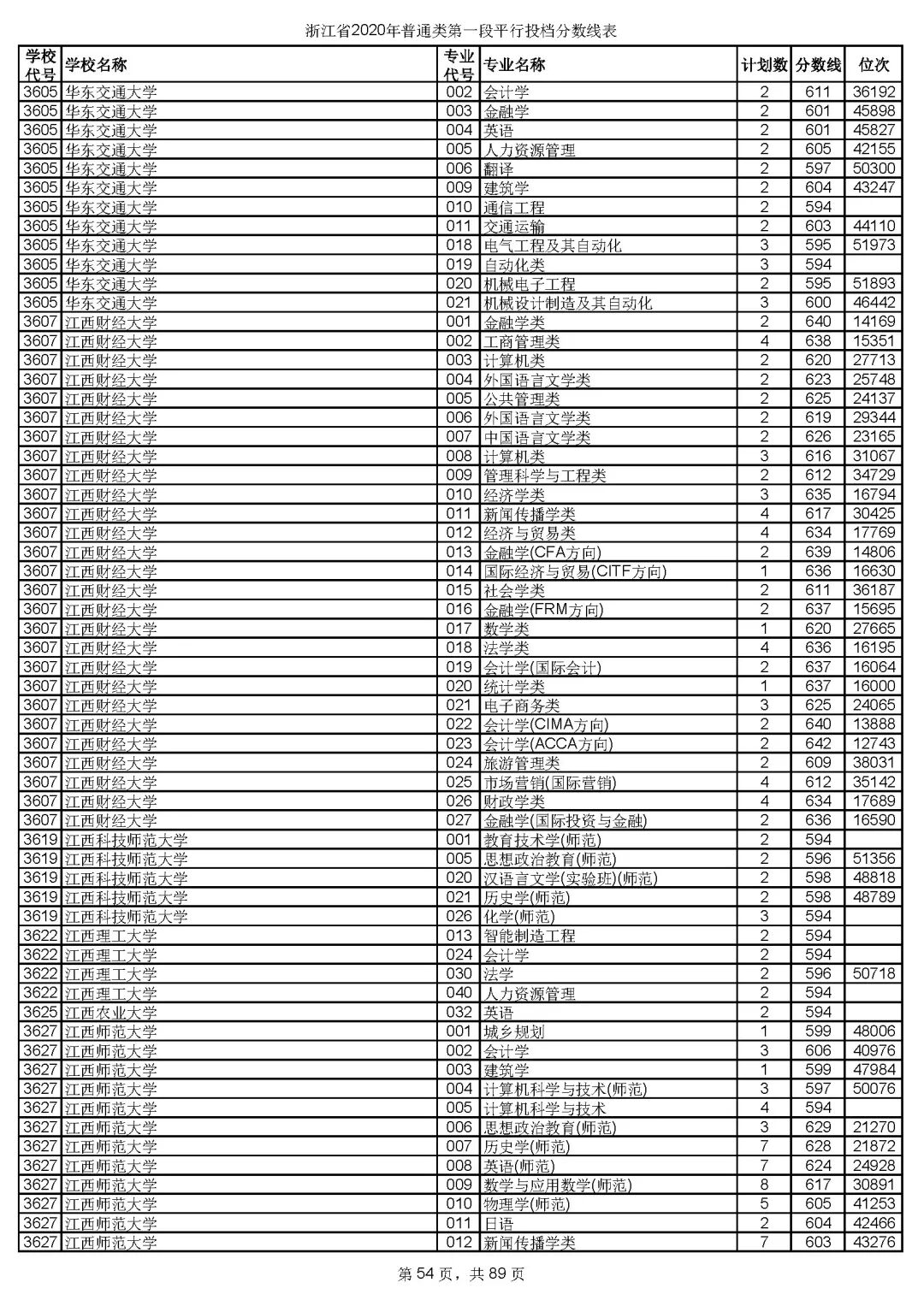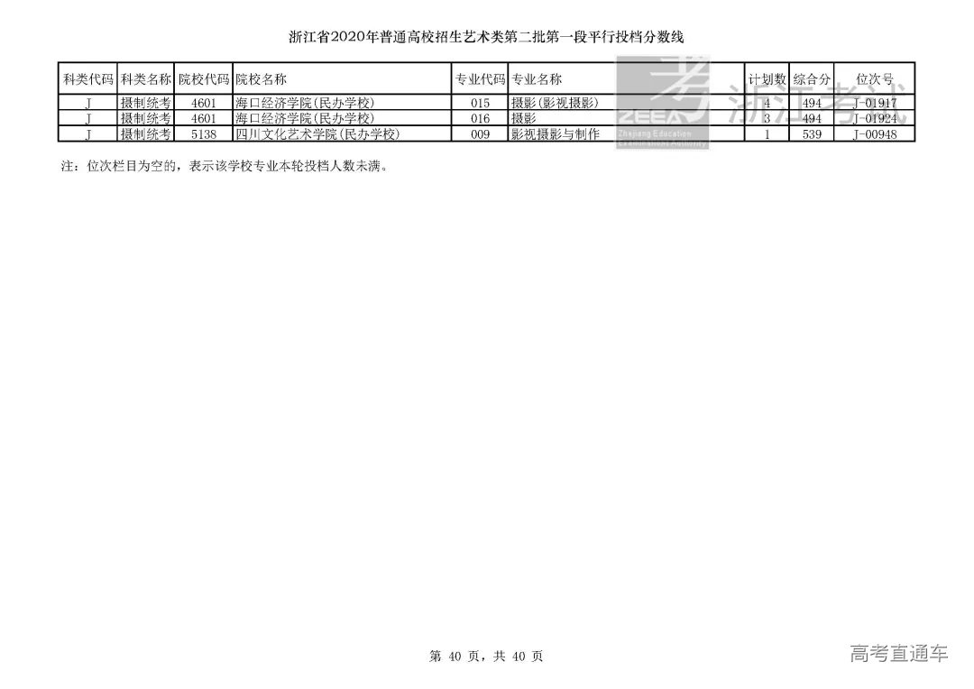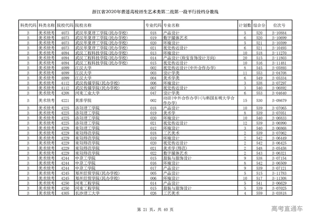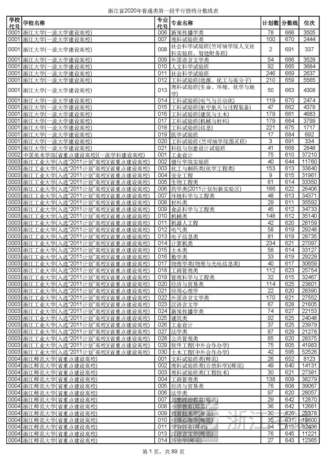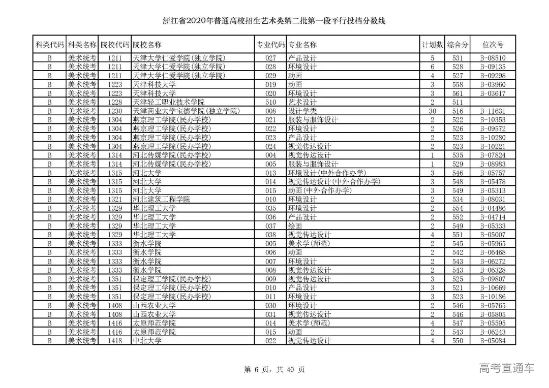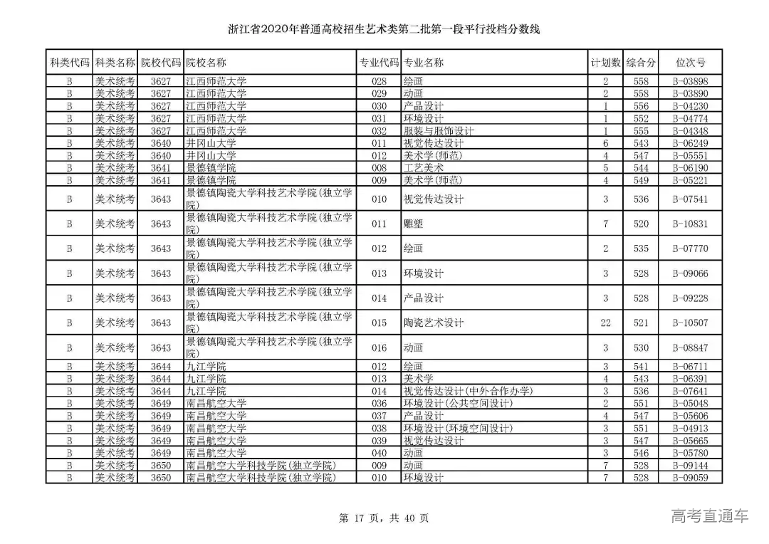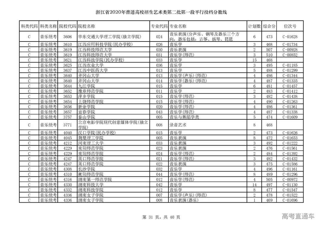 浙江省2020年艺术类第二批第一段平行投档分数线