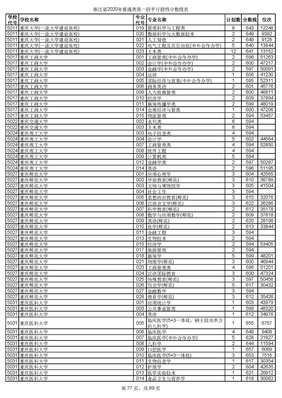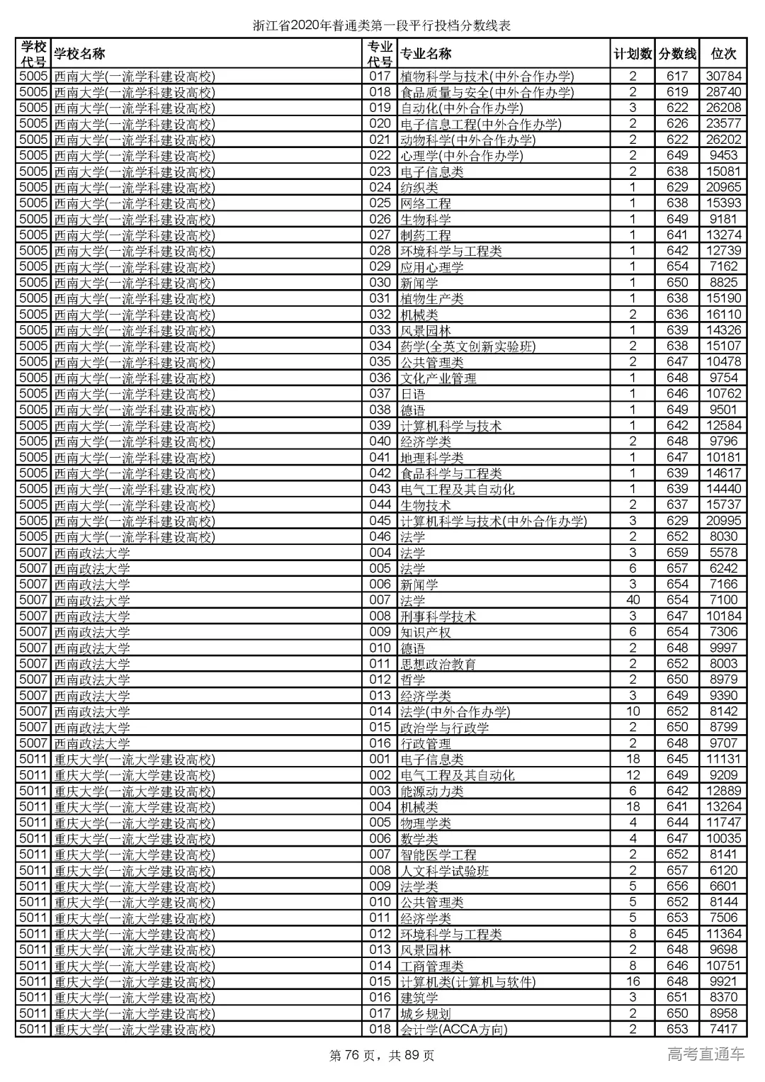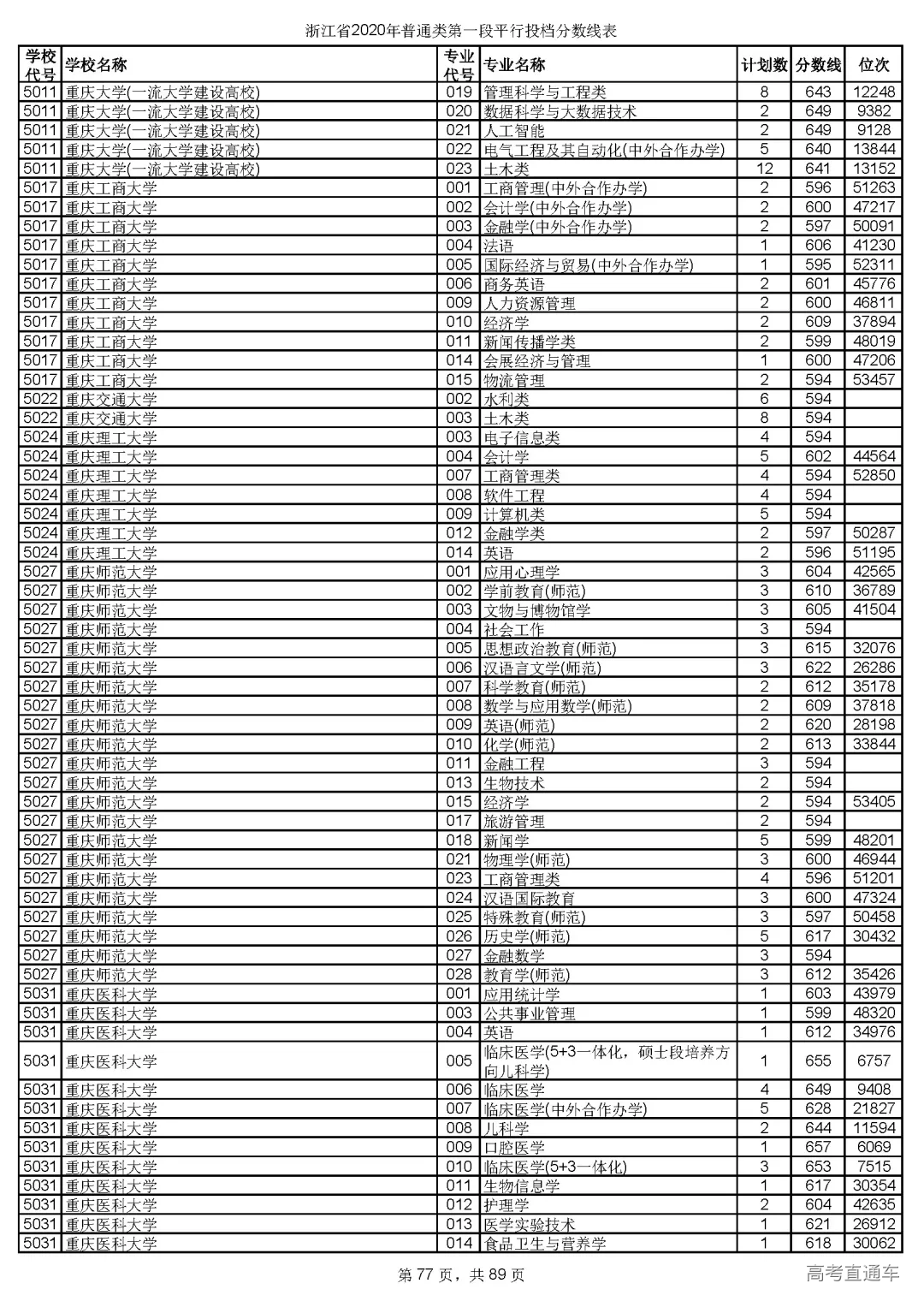 投档线怎么形成,怎样使用 浙江新高考招生实行专业平行志愿,按“分数优先、遵循志愿”的投档规则和招生计划1:1的比例,直接投到考生所填报的具体院校的具体专业(类)。被投档的最后一名考生的分数即为该校该专业投档线,由计算机投档后自动生成。 那么,平行投档分数线具体该怎么看,怎么知道是否被投档?考生根据投档分数线查询自己投档状态时,要按志愿顺序、对照位次依次进行,一旦符合条件即说明已经被该校该专业投档。高考总分相同时按位次、志愿顺序投档,若考生总分上线但位次或志愿序号未达到,仍将无法被投档到该专业。 需提醒的是,专业投档分数线的高低,主要由该院校专业报考生源人数、招生计划数所决定。报考人数尤其是高分考生多,就会导致专业投档分数线上升;专业招生计划数大,其投档分数线也会相对下降。因此,看各院校专业投档线时要与招生量结合,不能简单地把投档线与院校综合实力挂钩。比如,浙江大学及本省有关综合性大学在浙招生量大,为一段线上考生提供大量优质高教资源,某些专业(类)招生多达上百人,超出多数院校年度总招生量。 新高考专业平行志愿,因“不服从专业调剂而退档”的情况不复存在,但退档风险依然存在。若考生的体检、单科成绩等不符要求,还是可能会退档。平行投档每轮只有一次投档机会,一旦被投到其中一个志愿,其余志愿即同步失效;若投档后被退档,其他志愿也不能再投,只能再次参加后续志愿填报。 本轮高考招生投档录检完成后,剩余计划将于8月22日上午在浙江省教育考试院网站公布,二段考生和一段未被录取考生的志愿填报将于8月25-26日进行。 浙江省2020年普通类第一段平行投档分数线