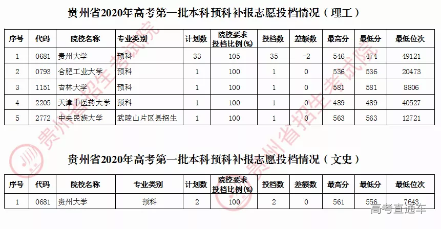 贵州省2020年高考第一批本科预科补报志愿投档情况如下: