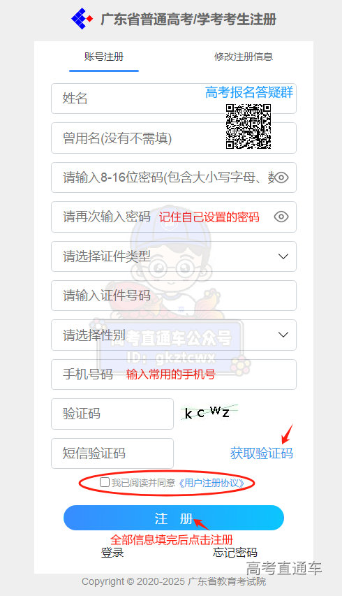 高考直通车提醒:全部考生网上报名前,需先进行注册,凭姓名、证件号注册考生账号,设置密码并绑定手机号。
