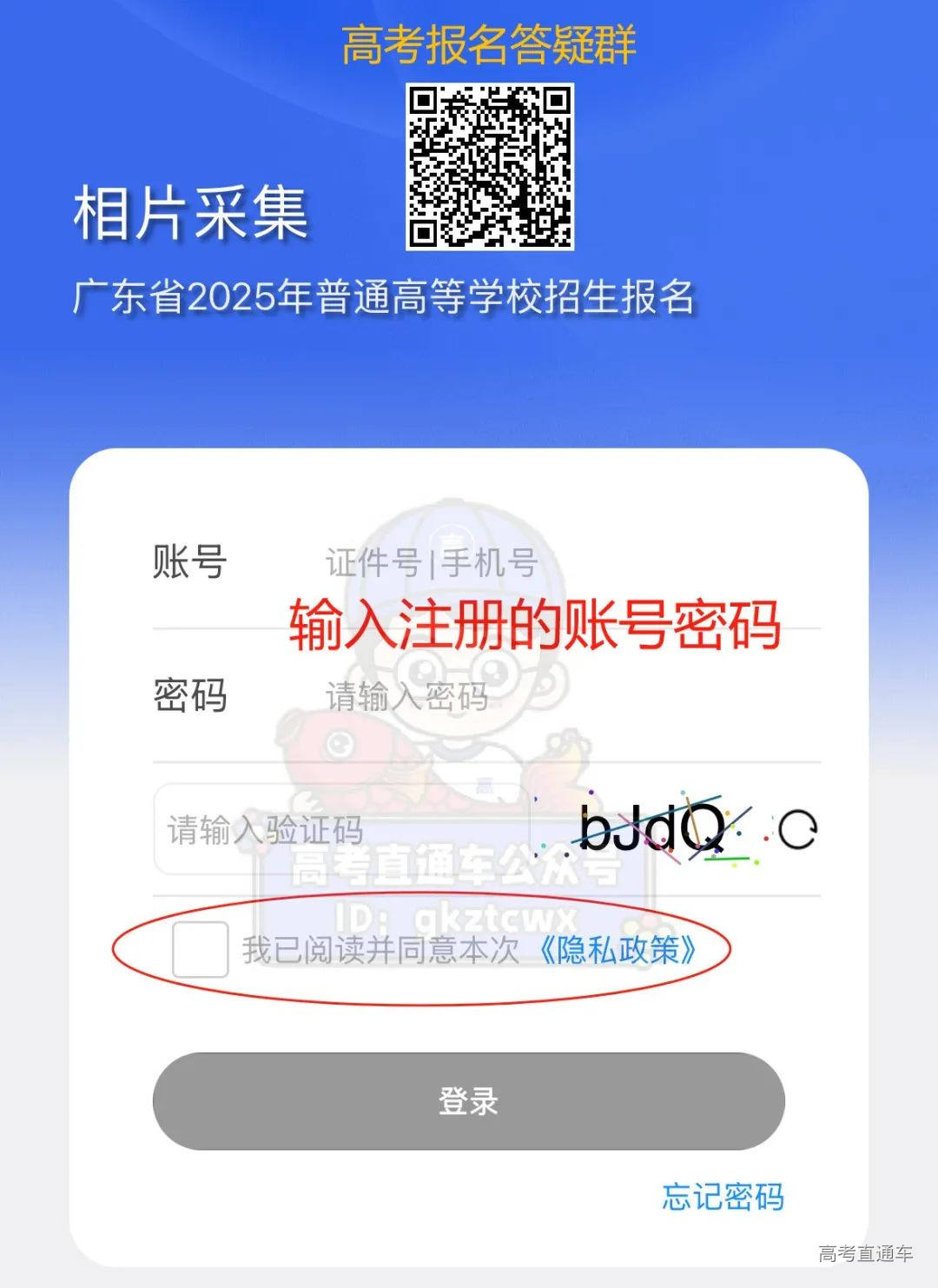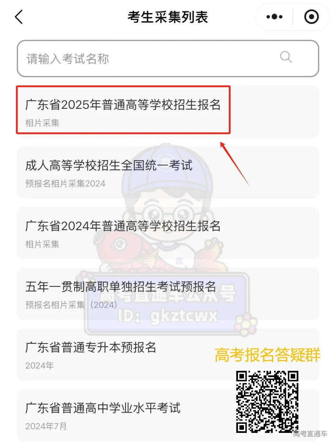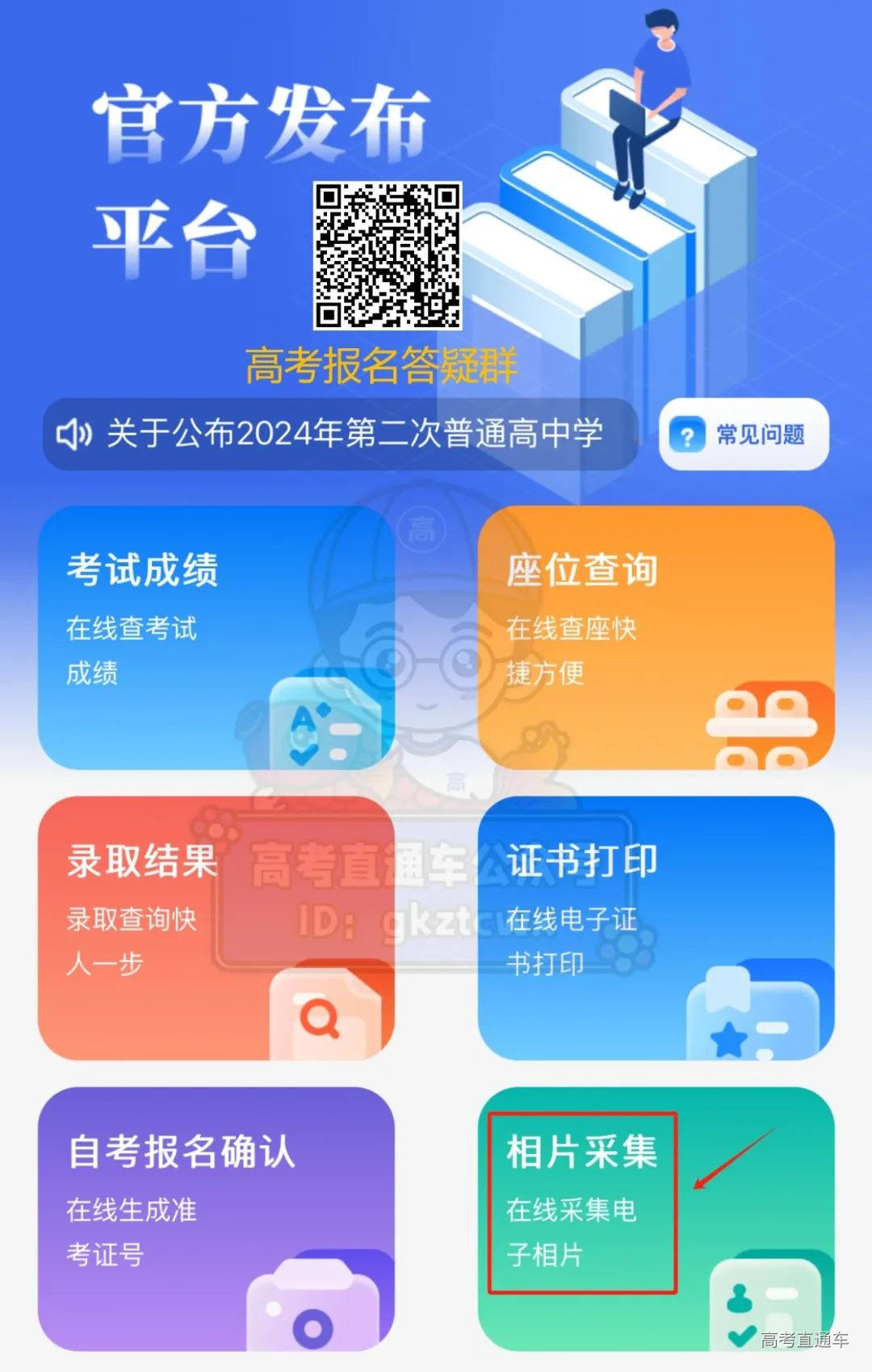 扫码关注高考直通车公众号,点击菜单栏的“广东高考拍照入口”,再点击“小程序”-“相片采集”进入微信小程序进行采集。
