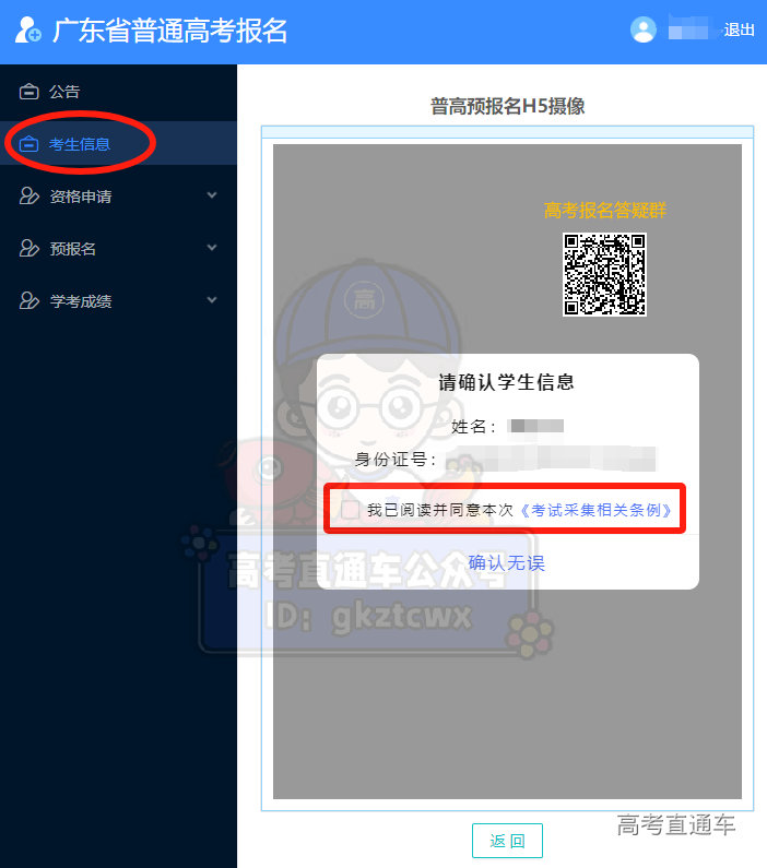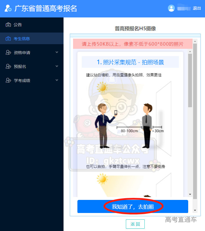在高考报名系统的考生信息页面,点击“H5摄像”,确认信息无误后,跳转页面查阅照片采集规范后,点击“我知道了,去拍照”,使用微信或主流浏览器进行扫码拍照即可。如需拍美照,进群找车车拿攻略哦