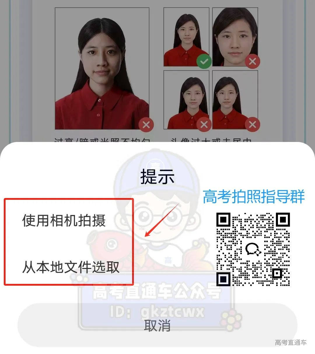 高考直通车提醒:部分同学的页面可能没有“从本地文件获取”的选项,可扫图上二维码咨询车车具体教程。