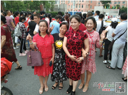 在送考家长队伍中,红色成为了主色调,不少妈妈们还选择了旗袍。
