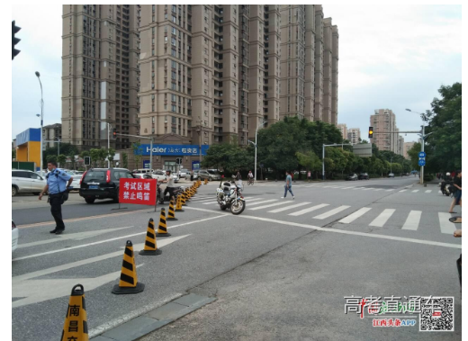 考点外围道路实施交通管制,提醒司机考试区域禁止鸣笛,为考试营造良好环境