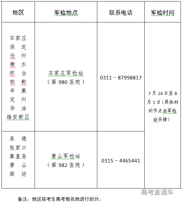 1.7月24日9时,考生可从河北省教育考试院网站(http://www.hebeea.edu.cn)查询是否列入军检范围,也可通过负责政治考核的人武部查询,按照全省军检站区域划分和各军检站具体安排,按规定时间到指定医院报到。