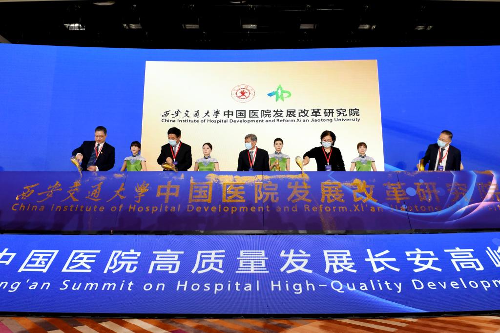 大会特设“西安交通大学中国医院发展改革研究院”揭牌环节。研究院的成立得到了知名专家和研究机构的广泛关注。中国工程院院士、西安交通大学管理学院名誉院长汪应洛教授发来贺信。会上,清华大学医院管理研究院张宗久院长、上海交大中国医院发展研究院沈洁院长、四川大学华西医院医院管理研究所文进所长、华中科大同济医学院附属同济医院医院管理研究所王华所长采用视频方式特别发来祝贺。王树国校长、刘宝琴主任、赵新勇总工程师、吕毅副校长、马辛格书记共同为研究院揭牌。