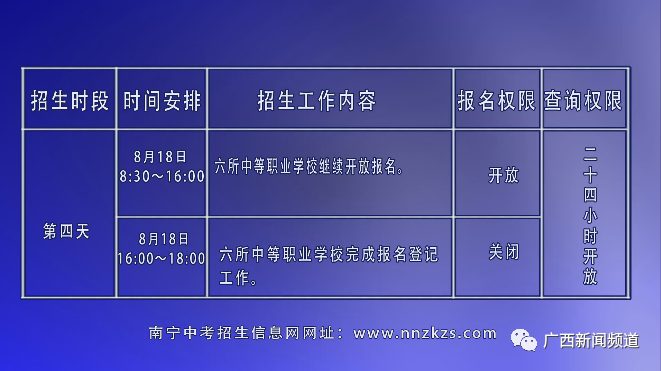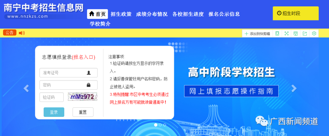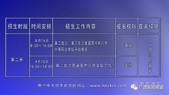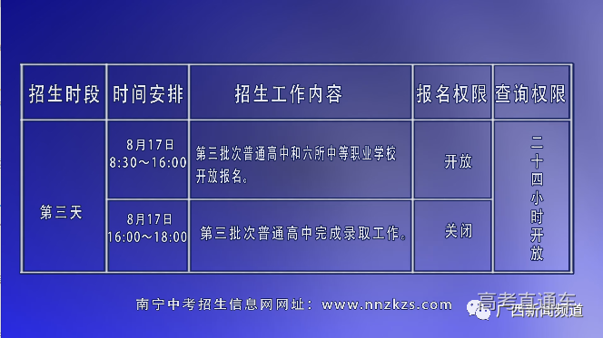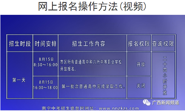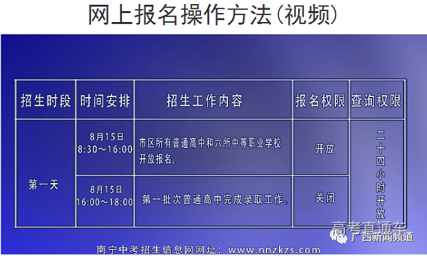 重点内容 今年南宁市市区高中阶段学校计划招收新生约4.67万人,其中,普通高中学校计划招生2.78万人,中等职业学校计划招生1.89万人。 市区11所公办自治区示范性普通高中共计划招收10152人,其中,南宁市第二中学、南宁市第三中学(含青山校区和五象校区)计划招收3888人,其他公办自治区示范性普通高中计划招收6264人。 按照自治区教育厅有关招生工作政策文件要求,今年自治区示范性普通高中指令性定向名额的招生比例保持在50%。今年南宁市市区内11所公办自治区示范性普通高中指令性计划50%的名额全部分配给承担地段生源的初中学校。其中,南宁市第二中学和南宁市第三中学指令性招生计划为3499人,定向分配的名额总数为1750人。南宁市第一中学、南宁市第八中学、南宁市第十四中学、南宁外国语学校、南宁沛鸿民族中学、南宁市第二十六中学、南宁市第三十三中学、南宁市第三十六中学和南宁市邕宁高级中学指令性招生计划为5638人,定向分配的名额总数为2822人。 划重点!请家长、考生需留意 ↓ // 市区高中阶段招生时间为8月15日至18日 市区高中阶段学校统一招生工作在8月15日至18日进行,其中普通高中招生在8月15日至17日三天时间内进行,在录取时间内各校的指令性(含定向生和非定向生)和指导性招生计划同时完成。中等职业学校招生工作与普通高中招生工作同步开始,8月18日完成网上报名登记工作。 报名方式有三种,考生可根据本人实际情况在规定时段内自主选择: (1)个人自助式报名。考生可在任何一台能稳定上网的电脑上自行操作,通过互联网进入指定报名网站实现网上报名。 (2)在初中学校参与报名。考生可回到原就读初中学校,在校内通过计算机网络教室参与网上报名。 (3)考生到指定的集中报名点报名。今年南宁市教育局中小学招生办公室(以下简称市中招办)在南宁市第三中学设立1个集中报名点、若干个报名窗口,考生可凭准考证到报名窗口,由市中招办工作人员协助考生报名。 市区内所有初中学校均在初三下学期的计算机课上开设了网上报名的课程培训,确保市内全体初中毕业生及毕业班教师学会网上报名操作技能。采用个人网上报名的考生,登录南宁中考招生信息网(www.nnzkzs.com)即可完成所有操作。在报名时段内,考生和家长在任何一台可以正常接入互联网的电脑即可实现网上报名、查询、改报、退出等操作,考生可通过网络报读市区内任何一所普通高中和采取网络预报名的中职学校。 // 规定时间内考生可任意选择报读、更改或退出 由于设立了通过互联网开放报名的模式,考生和家长有更多选择的时间和空间,即报名第一天开始,所有学校均开放报名权限,考生根据自己的中考成绩有选择性地报读不同层次的高中阶段学校;但需要注意的是,不同学校的录取时段有所区别,凡是过了报名录取时段的学校就不再接受报名。第一天是南宁市第二中学、南宁市第三中学(含青山校区和五象校区)进行录取,第二天为其他自治区示范性普通高中录取,第三天是生源未满的普通高中进行录取,第四天是南宁市第一职业技术学校、南宁市第三职业技术学校、南宁市第四职业技术学校、南宁市第六职业技术学校、南宁市卫生学校和广西南宁技师学院(原广西南宁高级技校)完成报名和预录取。 通过网站可以查询到考生本人需要的相关信息且不收取任何费用。在报名网站上,市中招办将分阶段免费提供中考成绩查询、招生文件政策查询、招生学校简介、报名实时信息、录取信息等内容,同时,中考成绩也可通过手机或短信进行查询。 // 普通高中招生不得招收择校生 南宁市严格执行教育部、教育厅关于取消招收择校生的规定,2020年中考招生,南宁市所有公办普通高中的招生计划全部通过中考报名系统公开、公正、公平录取。所有市区公办普通高中一年级学生(包括指令性计划和指导性计划)的学费均按所录取学校的指令性计划收费标准收取。同时需要提醒本市户籍考生,根据个人意愿,本市户籍考生既可报读公办普通高中的指令性计划,也可报读指导性计划,因指令、指导录取的收费标准一致,在中考报名时中考系统已自动帮助本市户籍考生选择“指令兼指导”两者兼报的报名方式,从而可让本市户籍考生获得更多的录取排序机会。 教育部门强调,招生工作结束后,严禁学校擅自招收已被其他学校录取的考生。 特别提醒特殊情况考生就读条件 (一)具有本市市区户籍但在外地就读初中学校的初中毕业年级学生申请就读南宁市普通高中程序:凡具有本市市区户籍但在外地就读初中学校的初中毕业年级学生,如需在南宁市市区内就读普通高中,原则上必须在南宁市市区报名参加初中学业水平考试(报名地点在南宁市招生考试院),凭南宁市市区初中学业水平考试成绩参加市区普通高中的报名录取。 (二)户籍不在南宁市市区,但在市区内初中学校就读的考生,可以以借考考生身份报名参加南宁市的中考,但只能报读南宁市普通高中指导性计划。