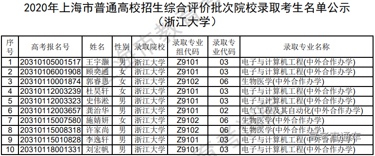 8月5日,浙江大学2020年上海市综合评价录取名单已经正式公布,共计录取10名考生。具体名单如下: