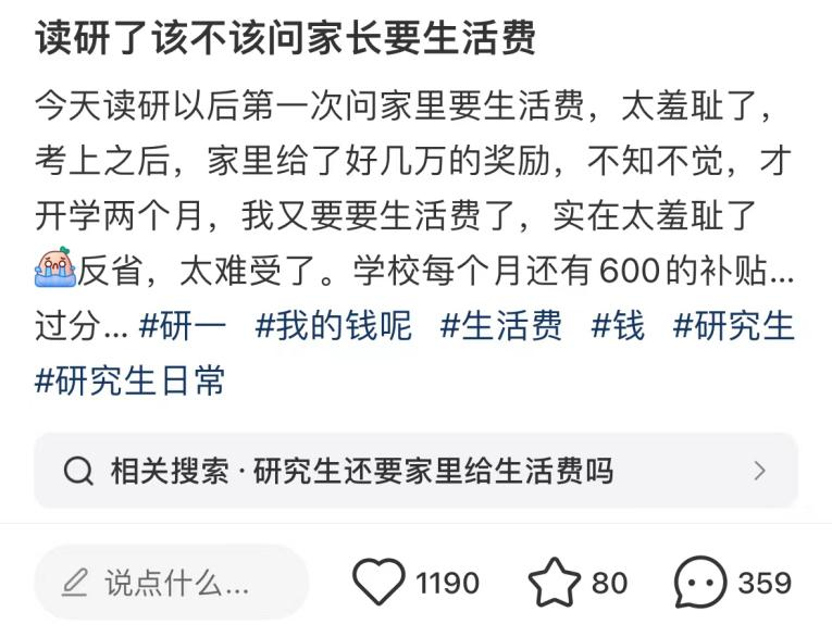 对于研一的新生来说,奖学金的帮扶作用相当重要。刚进入研究生教育阶段的他们缺乏收入来源,更依赖于新生学业奖学金。同时,大部分研究生受困于向父母索取的愧疚感,奖学金是研究生们生活费的重要组成部分。