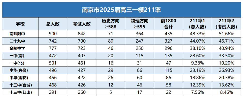 还有下图,网传这次一模211率统计。前1800的211线,这是南京传统的高分线,并非指南京只能考上1800个211。211线可以理解成省内211好专业的达线标准。