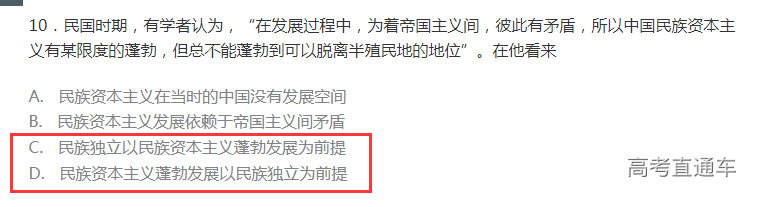 从C、D选项互为矛盾,有一个为错,A、B、D项主体都说的是民族资本主义,排除C项,B项用常识想一下,我们的民族资本主义,怎么可能依赖帝国主义,排除B。
