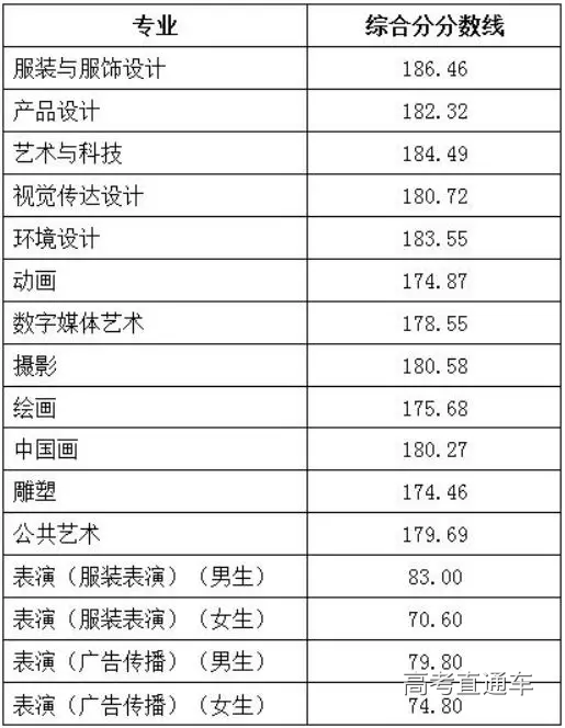 2.服装与服饰设计专业、产品设计专业、艺术与科技专业、视觉传达设计专业、环境设计专业、动画专业、数字媒体艺术专业、摄影专业、绘画专业、中国画专业、雕塑专业、公共艺术专业为生源省份本科一批录取控制分数线(或自主招生最低录取控制分数线)的60%和生源省份艺术本科录取控制分数线的高者。并且外语科目成绩不得低于60分(150分制)。