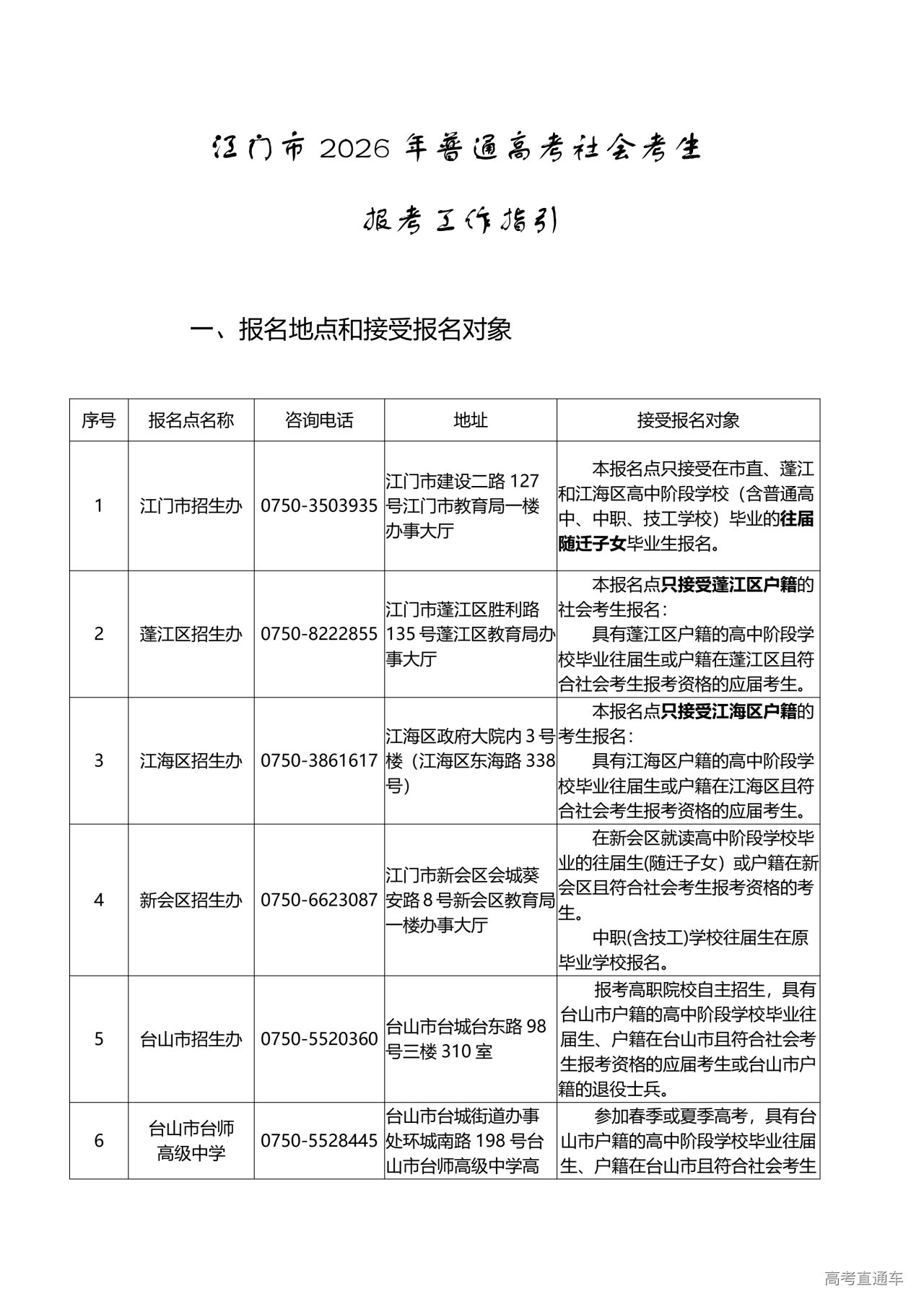 (二)报名地点:江门市社会考生(随迁子女考生按高中阶段学籍所在地为原则,户籍考生按户籍地为原则)在各县(市、区)招生办报名点进行报名,具体报名工作事宜请咨询相应的招生办了解,详细安排见《江门市2026年普通高考社会考生报名工作指引》。