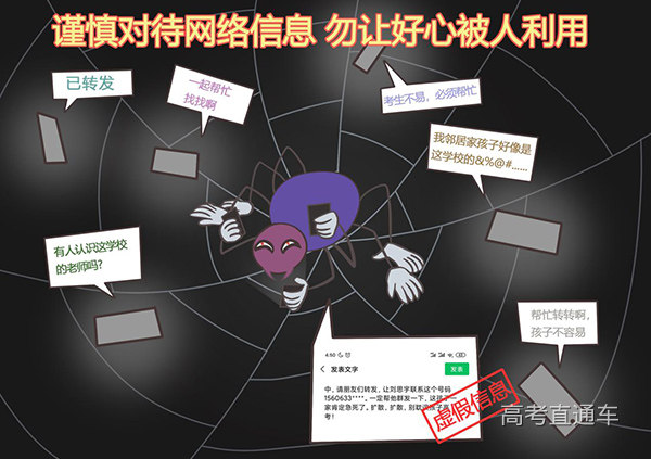 【提醒】看到类似信息,建议先跟考生所在中学或各省级招生考试机构公布的举报电话联系确认。在未经核实的情况,建议不做转发,更不要拨打信息中的联系电话。《中华人民共和国治安管理处罚法》第二十五条第一款规定:散布谣言,谎报险情、疫情、警情或者以其他方法故意扰乱公共秩序的,处5日以上10日以下拘留,可以并处500元以下罚款;情节较轻的,处5日以下拘留或者500元以下罚款。《刑法修正案(九)》规定:对于编造虚假的险情、疫情、灾情、警情,在信息网络或者其他媒体上传播,或者明知是虚假信息,故意在信息网络或者其他媒体上传播,严重扰乱社会秩序的,处3年以下有期徒刑、拘役或者管制;造成严重后果的,处3年以上7年以下有期徒刑。