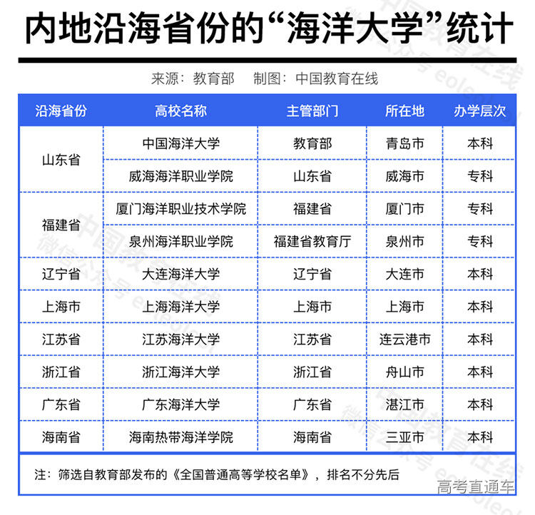 国内沿海省份现有“海洋大学”统计如下: