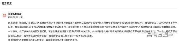 回复称:自治区人民政府已于2021年6月向教育部提出将北京航空航天大学北海学院与桂林电子科技大学北海校区合并转设为“广西海洋学院”。由于2021年下半年以来,教育部尚未启动“十四五”时期本科学校设置审批工作,北京航空航天大学北海学院与桂林电子科技大学北海校区合并转设为“广西海洋学院”事项暂未获得教育部批准。一年多来,我厅多次向教育部沟通汇报,请求加快推进设置“广西海洋学院”有关工作,并持续指导北海市和有关学校做好接受教育部考察评议有关工作。