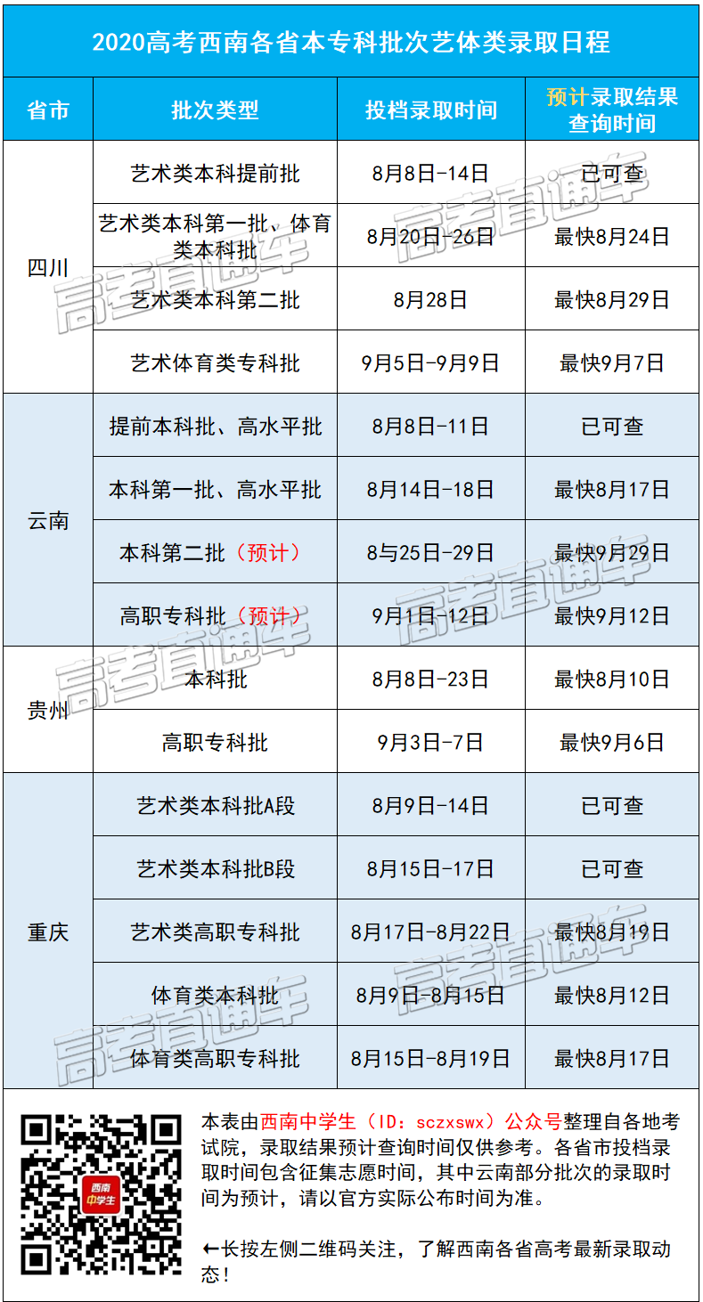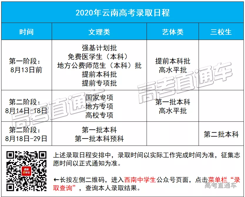 最新消息:云南本科一批今日开始录取!今日,云南省教育考试院正式发布了第三阶段的高考录取日程——8月18日-29日完成文理类第一批本科、第一批本科预科和三校生第二批本科的录取。四川、云南、贵州、重庆本科一批的录取结果什么时候能查?跟小西一起看看!