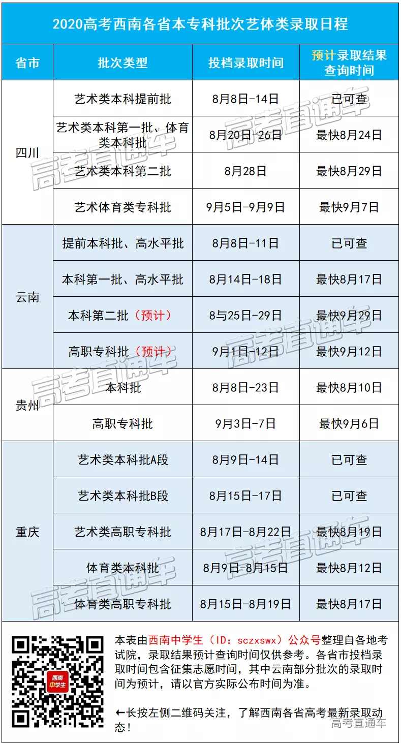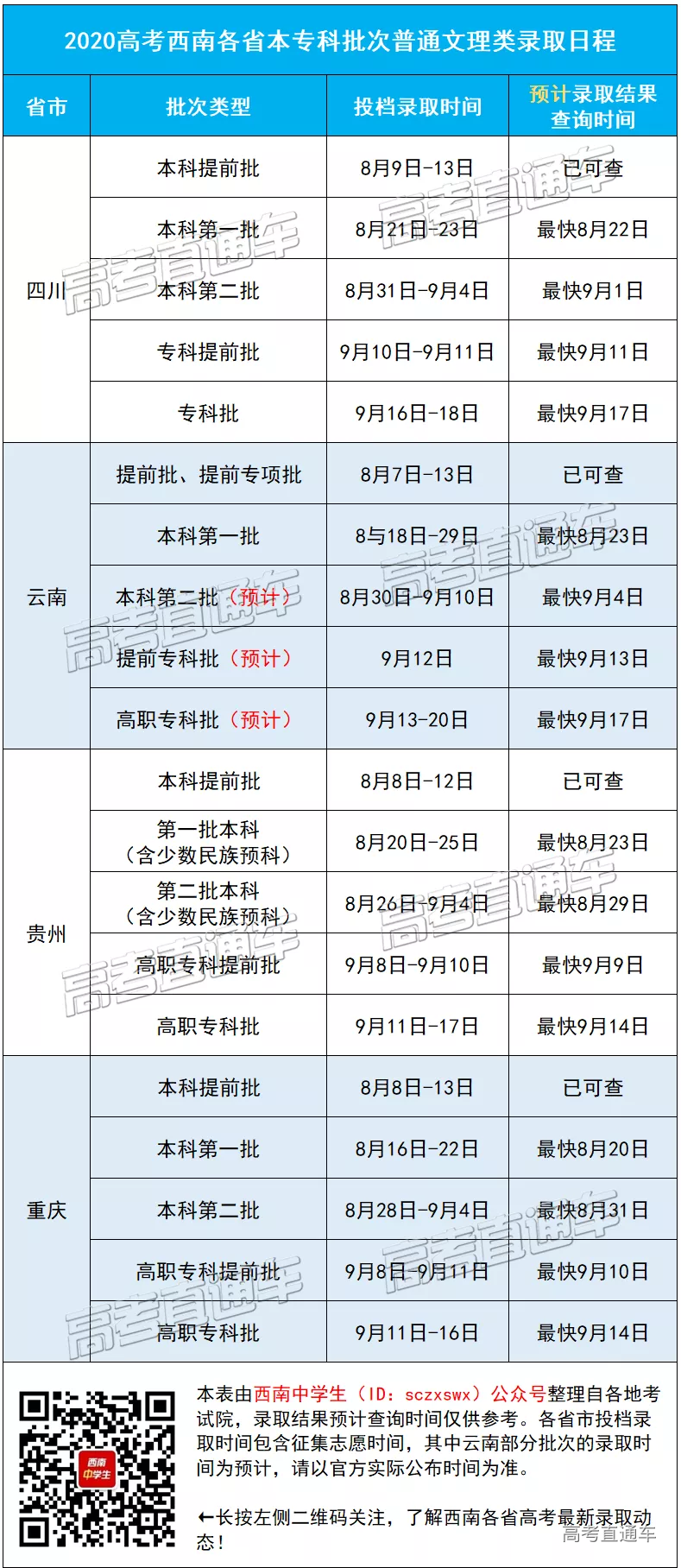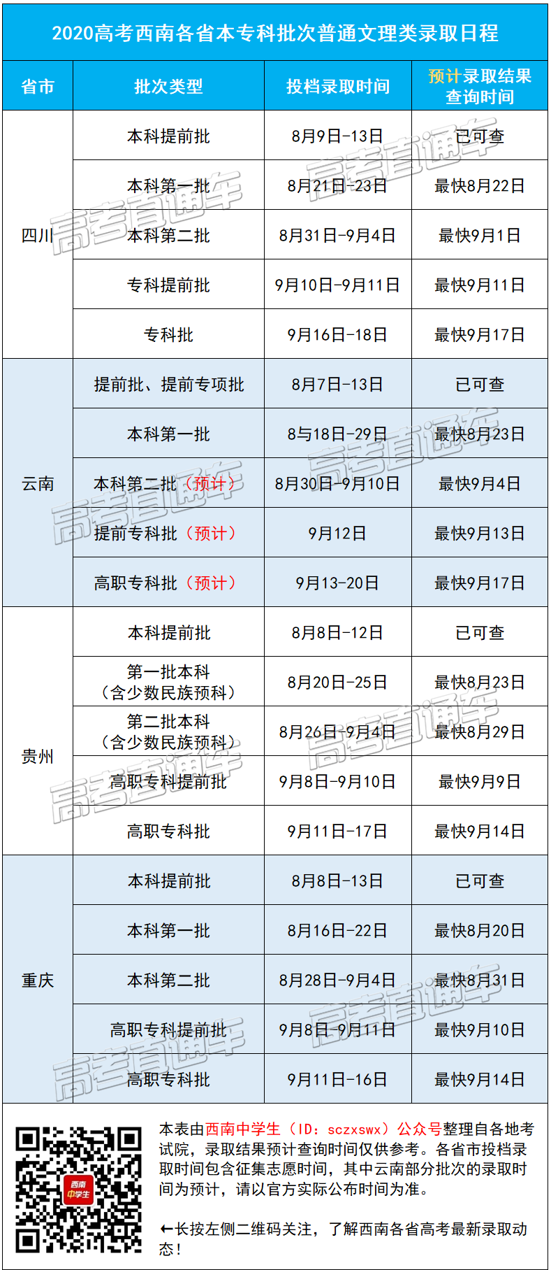 西南各省市什么时候能查到一本录取结果?西南中学生整理了最新版本的录取查询预计时间,供考生和家长参考↓↓↓