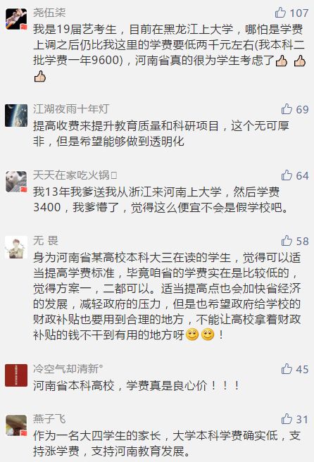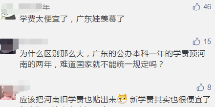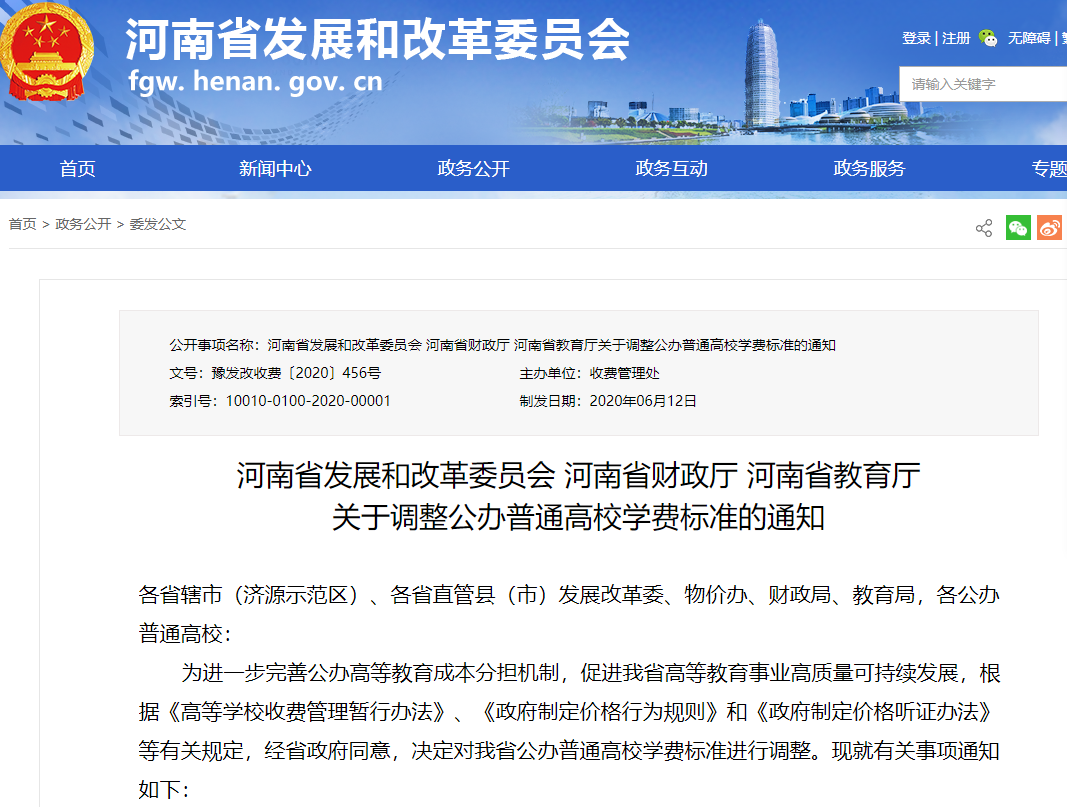 日前,河南省发改委、省财政厅、省教育厅三部门联合印发《关于调整公办普通高校学费标准的通知》。《通知》称,新学费标准自2020年秋季新学年起执行。据了解,河南省现行公办普通高校本科学费标准已16年未作调整。(一)本科学费标准。文科类4400元/生·年,理工类5000元/生·年,医学类5500元/生·年,艺术类8000元/生·年。(二)专科学费标准。文科类3700元/生·年,理工类4200元/生·年,医学类4800元/生·年,艺术类6000元/生·年。本次学费标准调整范围仅限河南省公办普通高校本科和专科学费标准,不包括研究生(含博士)、民办高校、独立学院、中外合作办学学费标准。学费调整实行“老生老办法、新生新办法”。2020年秋季学年起,河南省公办高校新招录的学生按照新标准规定执行,此前入学的在校学生仍执行原学费标准。各高校应当按学年收费,不得跨学年预收费用。