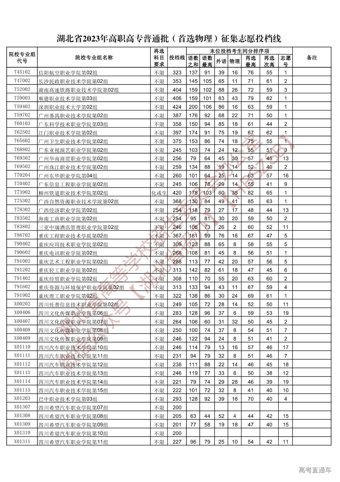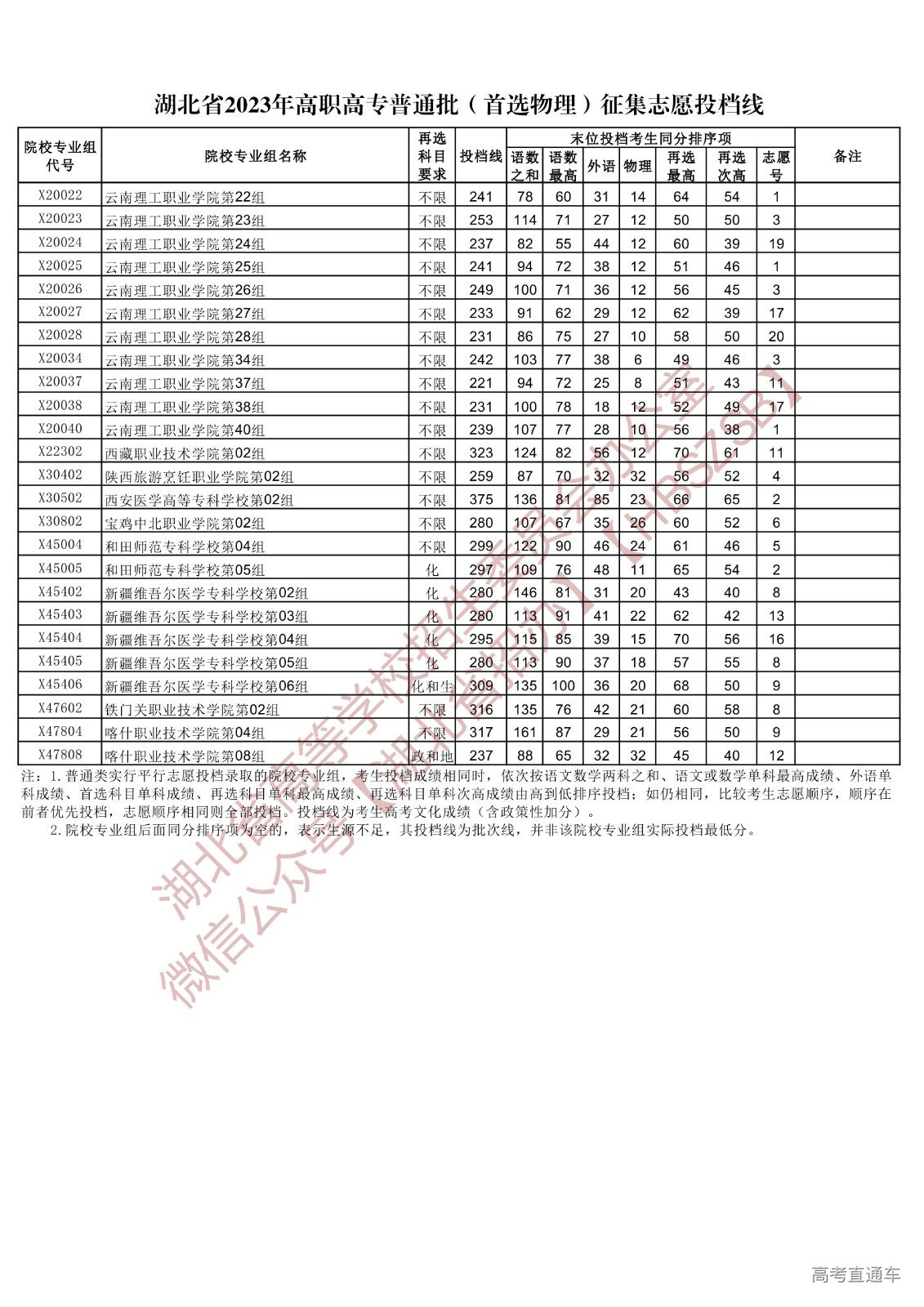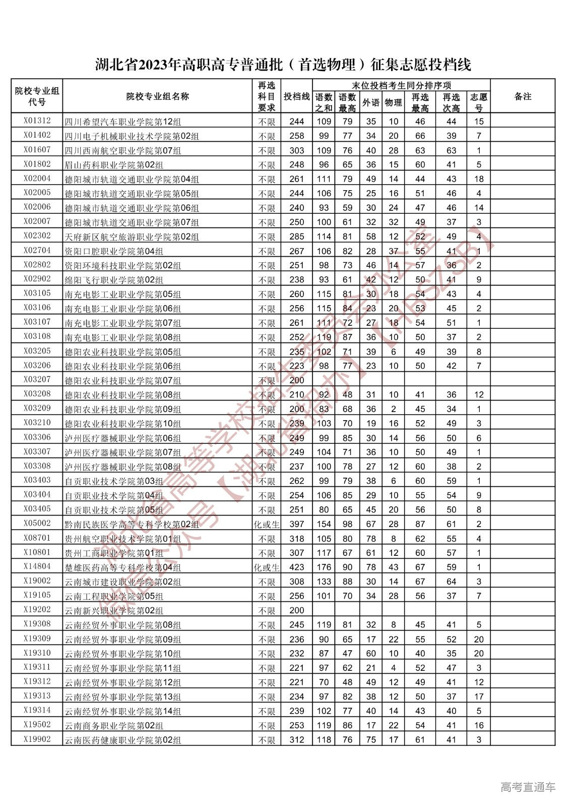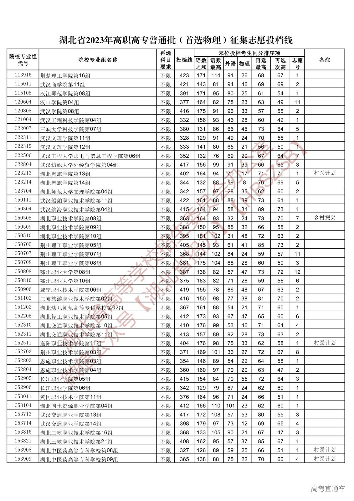 湖北2023年高职高专普通批(首选物理)征集志愿投档线