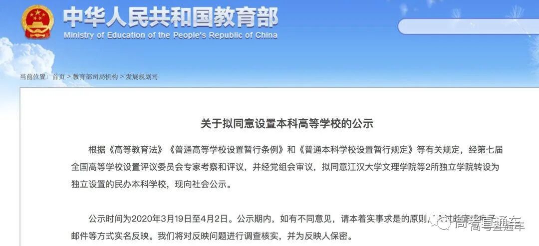 3月19日,教育部发展规划司官网发布《关于拟同意设置本科高等学校的公示》。