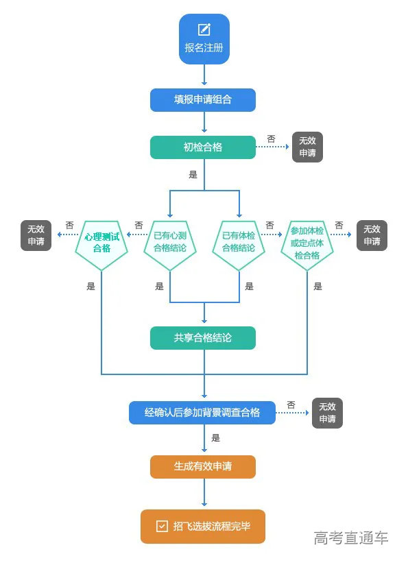 请务必在注册使用招飞系统前仔细阅读本手册! 未按本手册要求操作所带来的任何问题 将由您本人承担! 致参加民航招飞考生和家长的信 尊敬的各位考生和家长: 欢迎参加普通高校飞行技术专业(本科)2025年度高考招生的考前选拔工作。民航招收飞行学生工作由教育部和中国民用航空局统一领导,省级招办统一组织,招飞院校负责实施。 为了规范高考招生工作,更好地服务考生家长,2025年度招飞院校将继续在部分省市与航空公司合作招飞。请在参加招飞选拔前,及时登录招飞系统(gaokao.chsi.com.cn/gkzt/mhzf,点击“报名入口”),或登录微信小程序“民航招飞考生平台” 报名并联系有关单位招飞工作人员,获取更加详细准确的信息。 考生将使用本系统进行账号注册、填报招飞申请组合、查询选拔状态,并确认有效招飞申请。考生通过本系统确认的有效招飞申请,将作为填报飞行技术专业高考志愿的依据。因条件所限,系统还有许多需要不断改进完善的地方,感谢您的谅解和支持!预祝各位考生选拔顺利!高考成功! 中国民用航空招飞信息系统 2024年10月 第一部分 特别提醒 1、请务必通过本系统参加招飞选拔工作。由于飞行技术专业对考生的身体、心理等方面有特殊要求,在您参加高考之前,需在本系统注册报名、通过一系列选拔工作并最终确认有效招飞申请。一定不要由其他单位或个人代您注册! 2、请务必根据本系统有效招飞申请填报高考飞行技术专业志愿。根据民航局、教育部《普通高校飞行技术专业招收飞行学生实施办法》,考生通过招飞系统确认的“有效招飞申请”,将作为考生填报飞行技术专业高考志愿的依据。考生所报院校不在“有效招飞申请”范围内的,招飞院校不予录取。这意味着与报考其他普通专业不同,您在高考前就提前确定了飞行技术专业的高考志愿范围,即本系统的有效招飞申请。一定不要在高考志愿中填报本系统有效招飞申请以外的其他招飞院校,否则招飞院校无法录取。 3、请务必在系统开通(2024年10月21日)后注册准确的个人信息、填报招飞申请组合并参加后续选拔工作。系统将于2025年5月31日正式关闭。 4、请务必在系统开通确认有效招飞申请阶段(2025年2月5日至各送培单位自行设定的截止日期)再次登录本系统选择符合要求的招飞申请组合进行确认。请务必在参加背景调查之前登陆系统对相应的申请组合进行确认! 5、一定不要在注册时填错任何注册信息!为保证选拔结果准确,注册关键信息不得修改、删除或撤回! 6、一定不要在未填报某一申请组合或未通过某一申请组合的初检就参加该申请组合的体检! 7、一定不要在申请组合体检状态为“在体检”(即招飞系统上还未得出体检结论)时,去参加其他申请组合送培单位组织的体检! 8、一定不要在同意招飞主管安排的体检后无故不去,或在体检中途无故中断体检,这样只会耽误您更多时间! 9、一定不要轻易与任何单位签订承诺书,线下确认的有效招飞申请须与招飞系统有效招飞申请一致! 10、一定不要相信任何人对您高考录取的任何承诺! 以上注意事项未尽事宜,将在招飞系统补充提醒,敬请关注! 第二部分 报考须知 1、什么是民航招飞? 民航招飞是指普通高校飞行技术专业(本科)通过高考招收飞行学生。 2、谁能参加民航招飞? 欢迎广大热爱并有志从事祖国民航事业的2025届普通高中毕业生参加民航招飞,但还需要符合高考报考条件、招飞体检鉴定标准和民用航空背景调查要求等。 3、谁来实施民航招飞? 招飞院校负责实施民航招飞。如果您被这些招飞院校中的一所录取为本校飞行技术专业新生,表示您将成为该校的普通全日制本科在校学生,将在该校参加理论学习,并由学校或公司安排参加飞行训练,毕业时将获得该校本科文凭。目前,经教育部批准的开设飞行技术专业(本科),并已在民航招飞系统开通账号的招飞院校有中国民用航空飞行学院、北京航空航天大学、南京航空航天大学、中国民航大学、山东航空学院、沈阳航空航天大学、上海工程技术大学、南昌航空大学、黑龙江八一农垦大学、安阳工学院、烟台南山学院、常州工学院、南昌理工学院、山东交通学院、郑州航空工业管理学院、北京理工大学珠海学院、南京航空航天大学金城学院、昆明理工大学、西安航空学院、太原理工大学、内蒙古工业大学。请注意,各招飞院校当年招飞的地区可能不同,具体请咨询当地考试院或联系各招飞院校。 4、民航招飞包括哪些环节? 当您在招飞系统注册报名后,将按照通知要求,陆续参加预选初检、民航招飞体检鉴定、飞行职业心理学检测、确认有效招飞申请、参加民用航空背景调查等选拔流程。您还需要参加高考,并根据您在招飞系统上的有效招飞申请,正式填报飞行技术专业高考志愿。对高考成绩达到招飞录取分数线以上的考生,按学生高考志愿和高考成绩,由招飞院校根据招生计划,择优录取。当您入校报到后,还需要参加招飞体检入校复查,合格的方可注册获得学籍,并继续参加飞行技术专业的学习与训练。招飞系统将记录您的个人信息,以及您参加预选初检、体检鉴定、心理学检测、背景调查的选拔情况,并最终形成您的有效招飞申请。 5、如何进入招飞系统? 教育部阳光高考平台是中国民用航空招飞信息系统唯一入口!您可打开“教育部阳光高考平台民航招飞报考