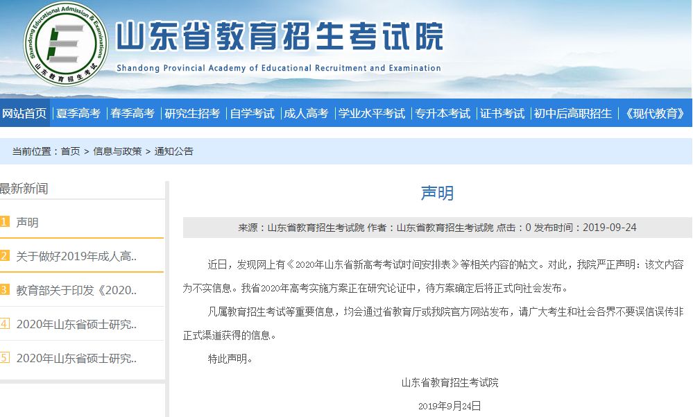 近日,发现网上有《2020年山东省新高考考试时间安排表》等相关内容的帖文。对此,我院严正声明:该文内容为不实信息。我省2020年高考实施方案正在研究论证中,待方案确定后将正式向社会发布。