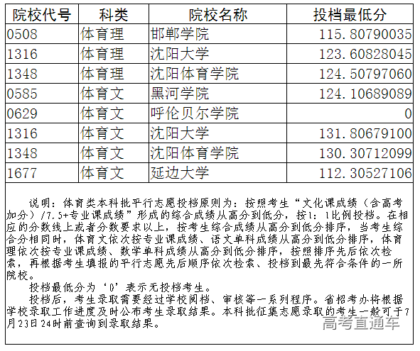 2019年辽宁省体育类本科批征集志愿投档最低分