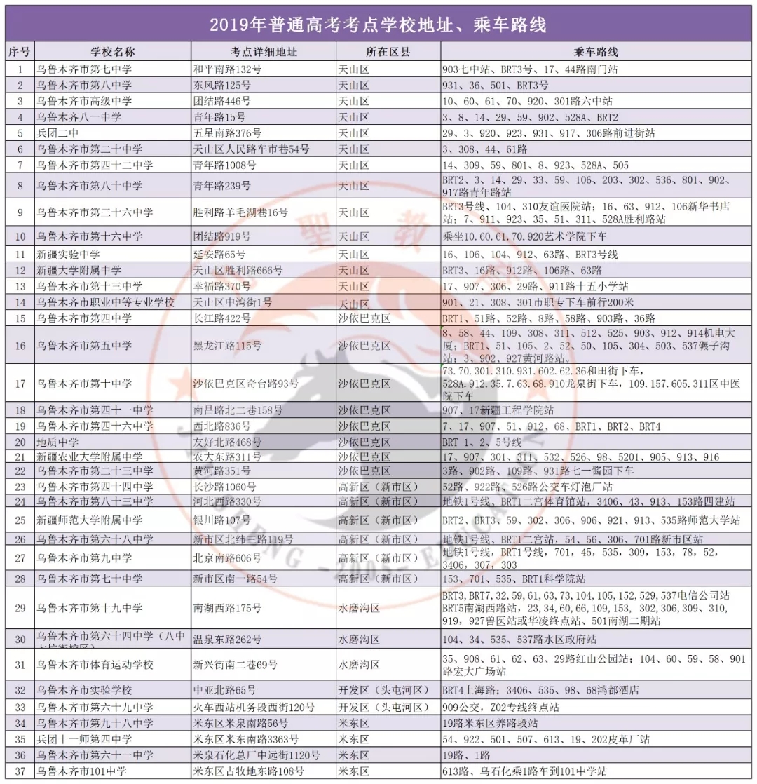2019乌鲁木齐市高考考点学校地址及乘车路线公布