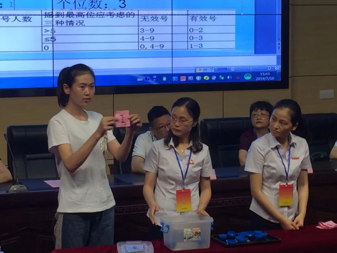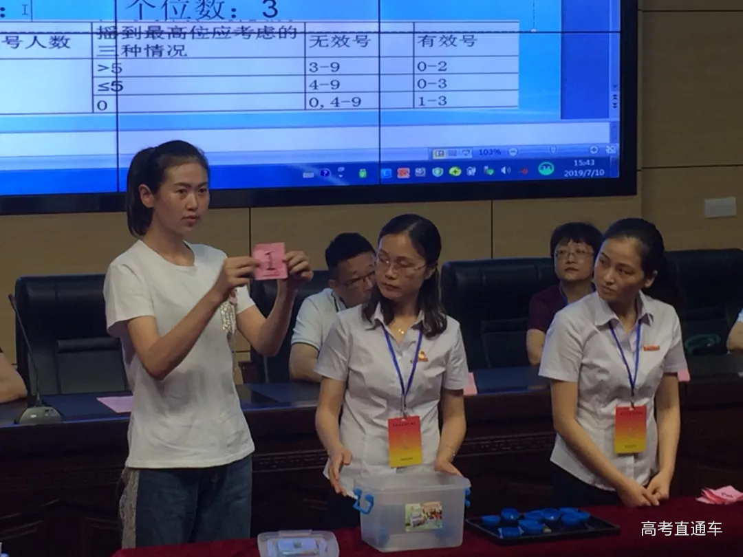 (2)现场由媒体代表、人大代表(政协委员)、学生家长代表(从到场学生家长代表中推选)各1人依次分别从十个号码球中(内置0至9十个号码)摇号抽取个、十、百、千位数号码(如需要千位数,则由另一位人大代表或政协委员抽取),组成一个数字,与该数字相同随机编号(001或0001即为1,002或0002即为2……099或0099即为99,以此类推,0999即为999)的学生即为第一个中签录取的学生。第一个录取学生的随机编号必须在具体摇号学校参与摇号的学生编号(1至n)内产生。为保证先抽中号码有效,后面抽签时应先剔除无效号码。也即个位最优,十、百、千(如有)依次递减。