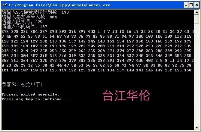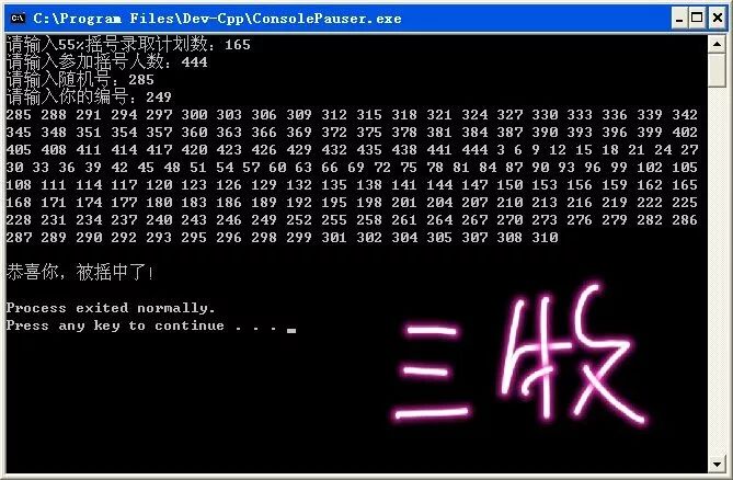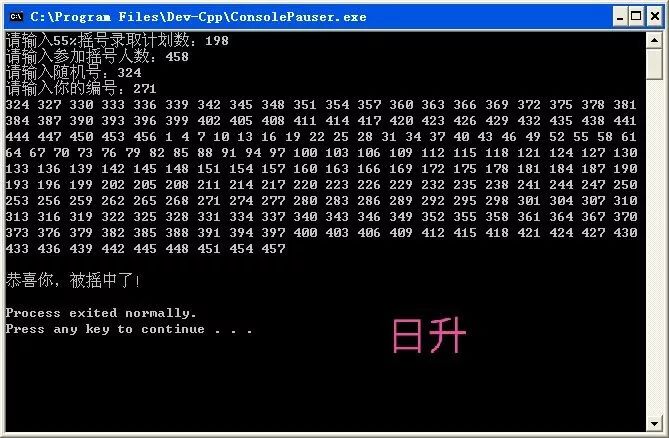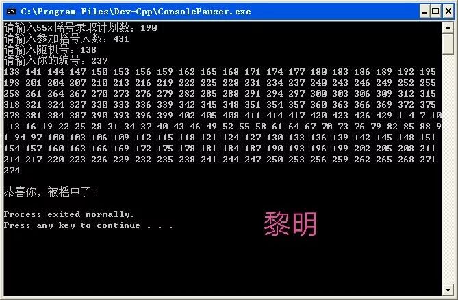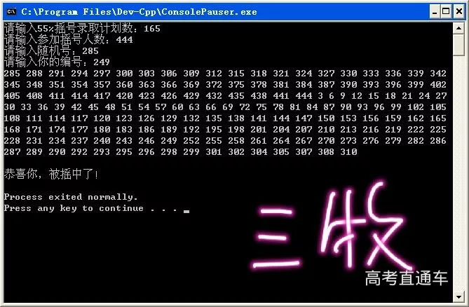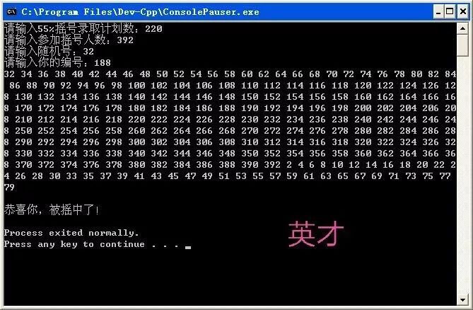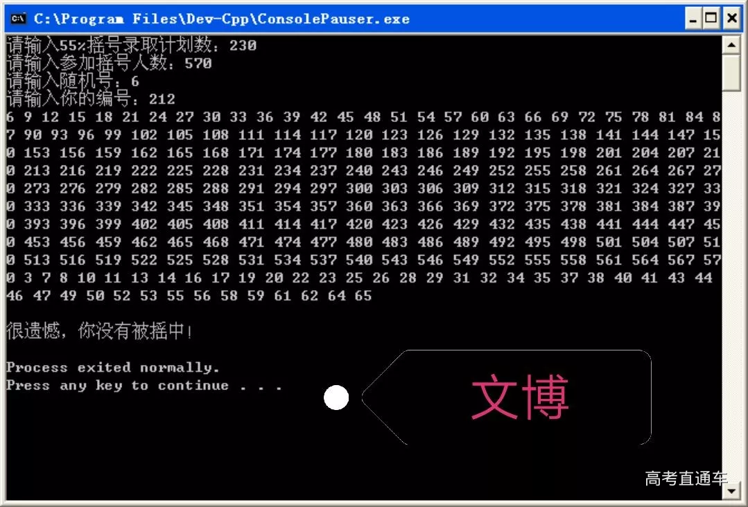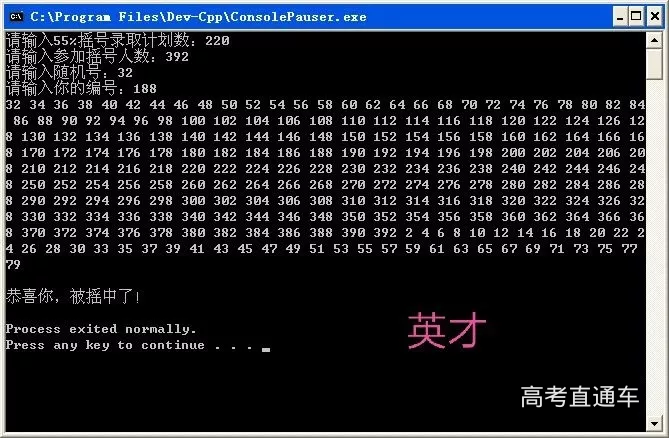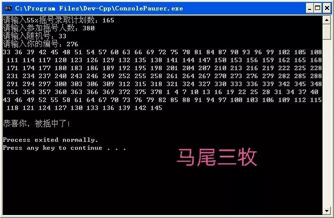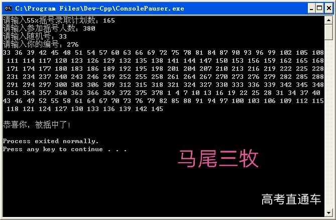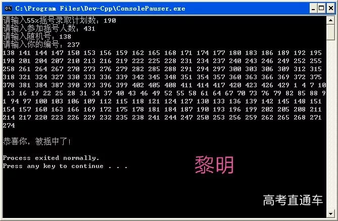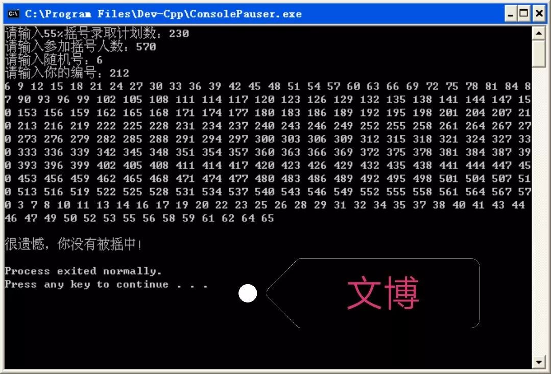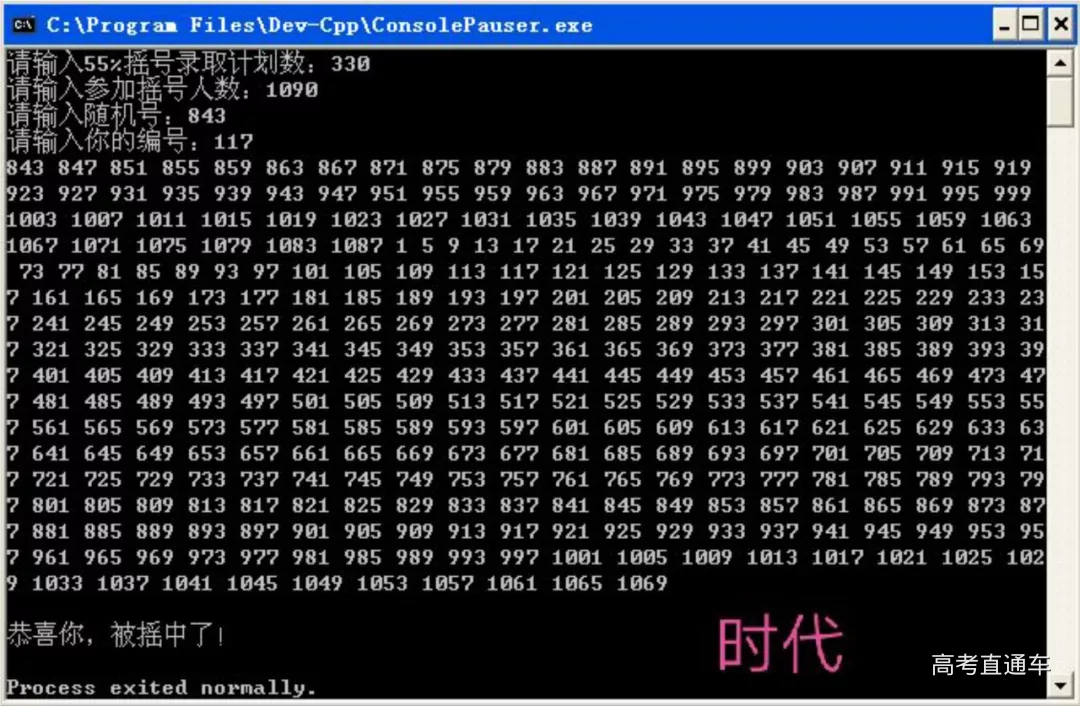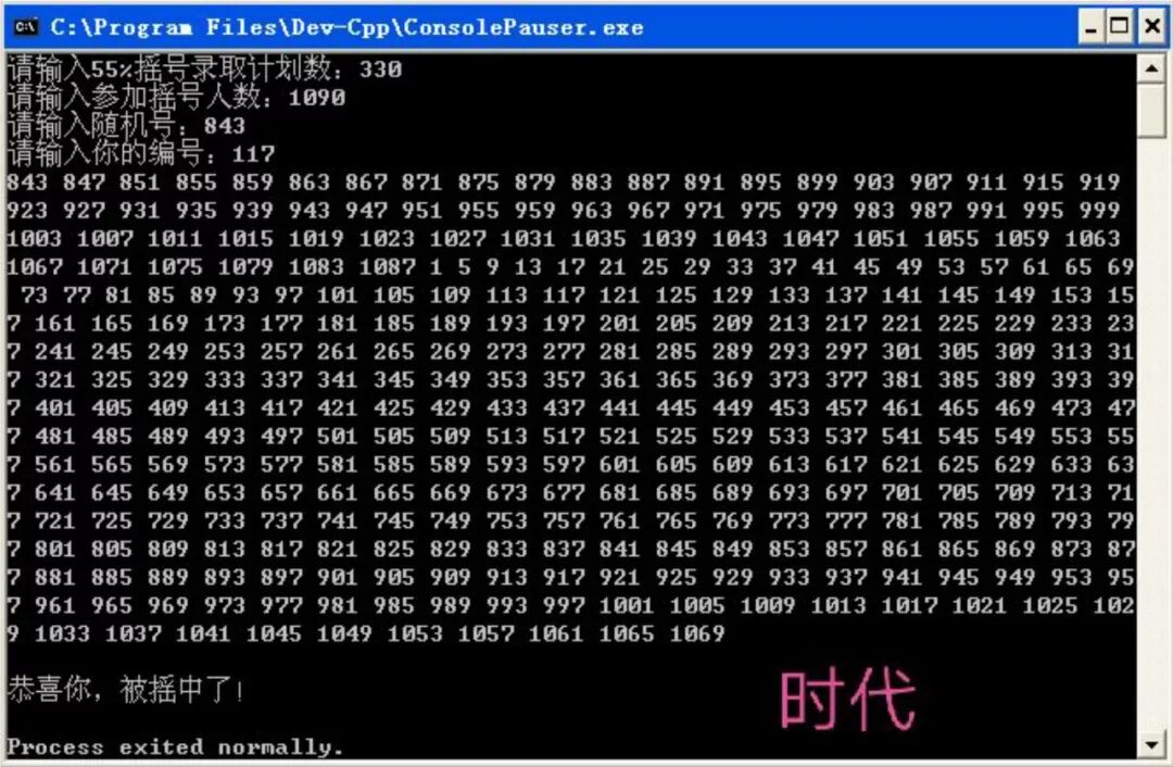 (4)如果出现一直循环未能招满时(当参加摇号数是等差数的整数倍时可能出现),余下摇号录取计划则继续录取第一位录取学生的随机编号后的连续号(即等差数为1),直至完成摇号录取计划数为止。