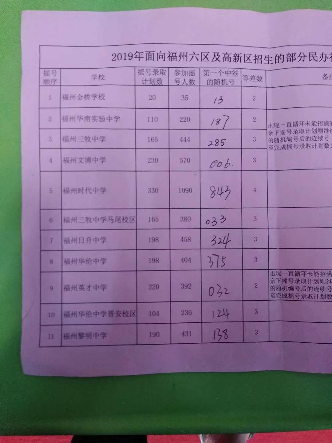 福州市五城区2019年部分民办学校摇号录取结果信息