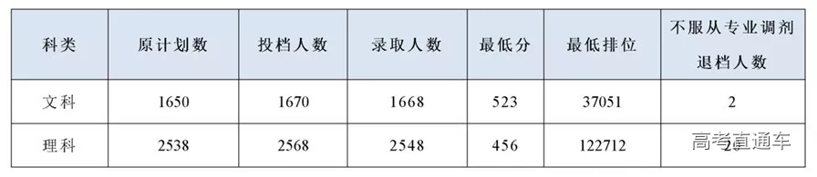 我校文科原计划1650人,调入20个预留计划投档,投档1670人,投档分为523分(最低排位37051),比省控线高68分;理科原计划2538人,调入30个预留计划投档,投档2568人,投档分为456分(最低排位122712),比省控线高66分。文科录取最高分为552分,最高排位16791;理科录取最高分为518分,最高排位53989;文科有12人、理科有87人超过高分优先投档线。文理科投档我校并服从专业调剂的考生全部录取,共有22人因所报专业无法录取并且不服从调剂的考生均退档。