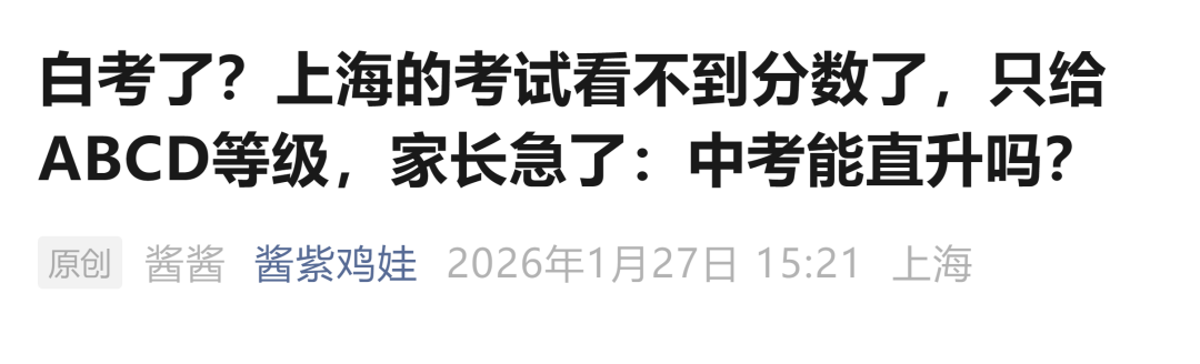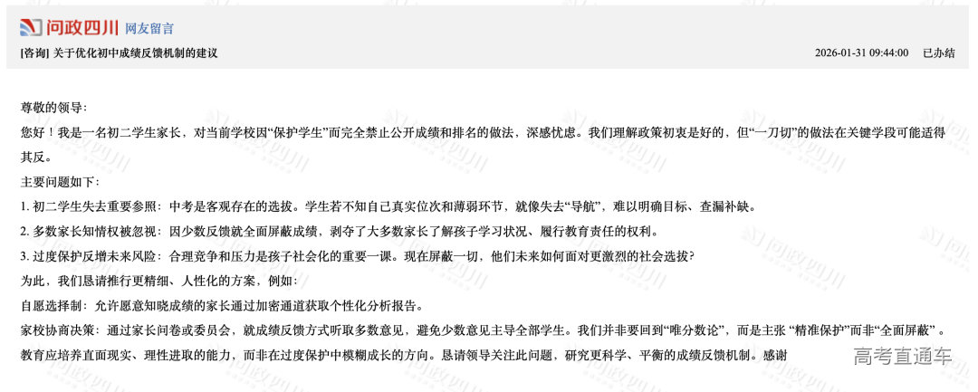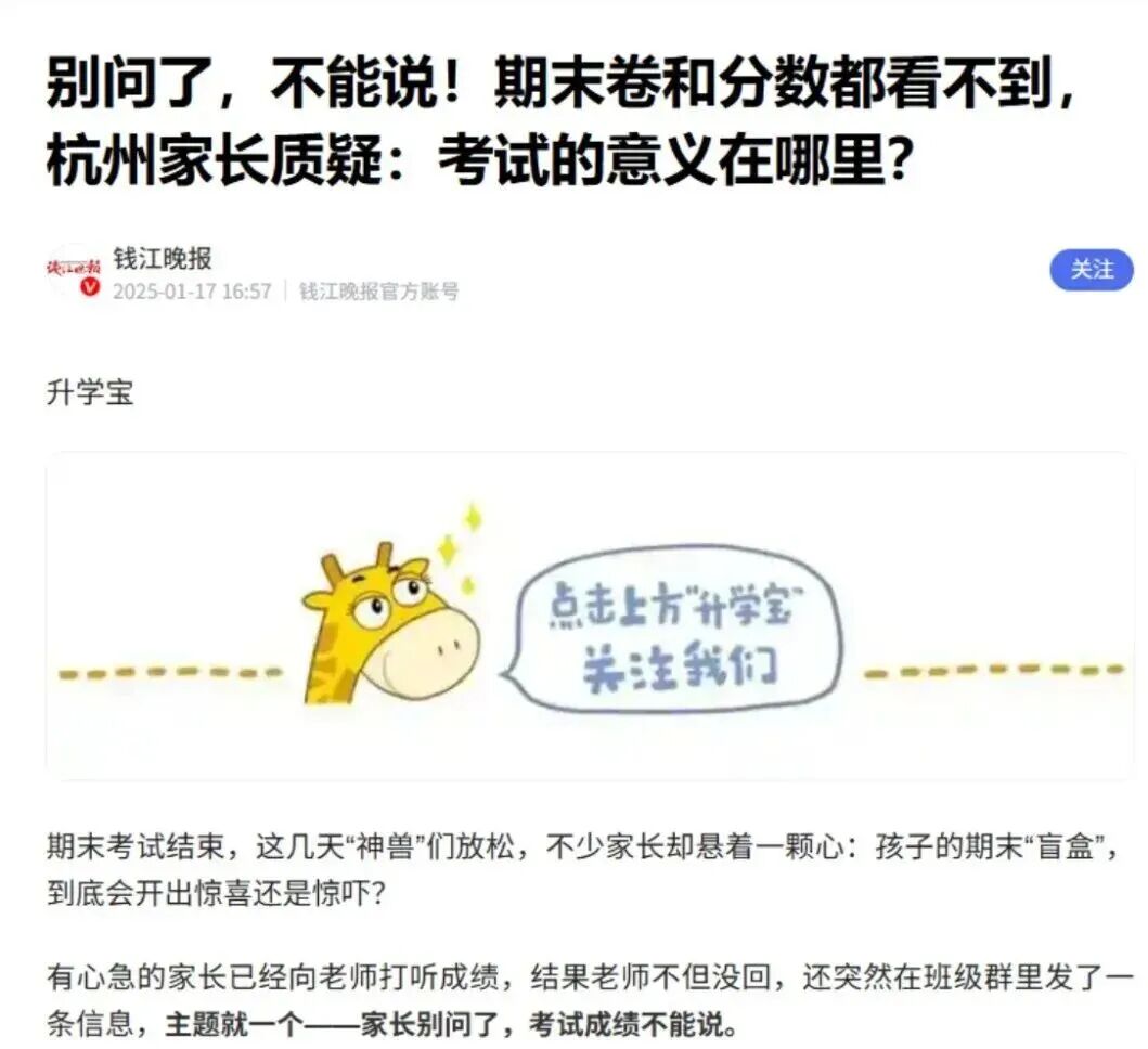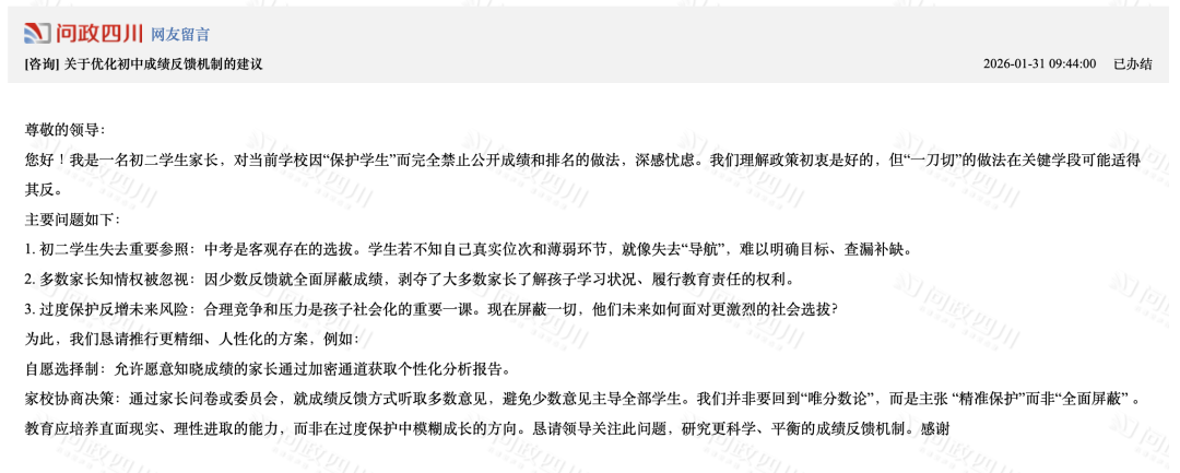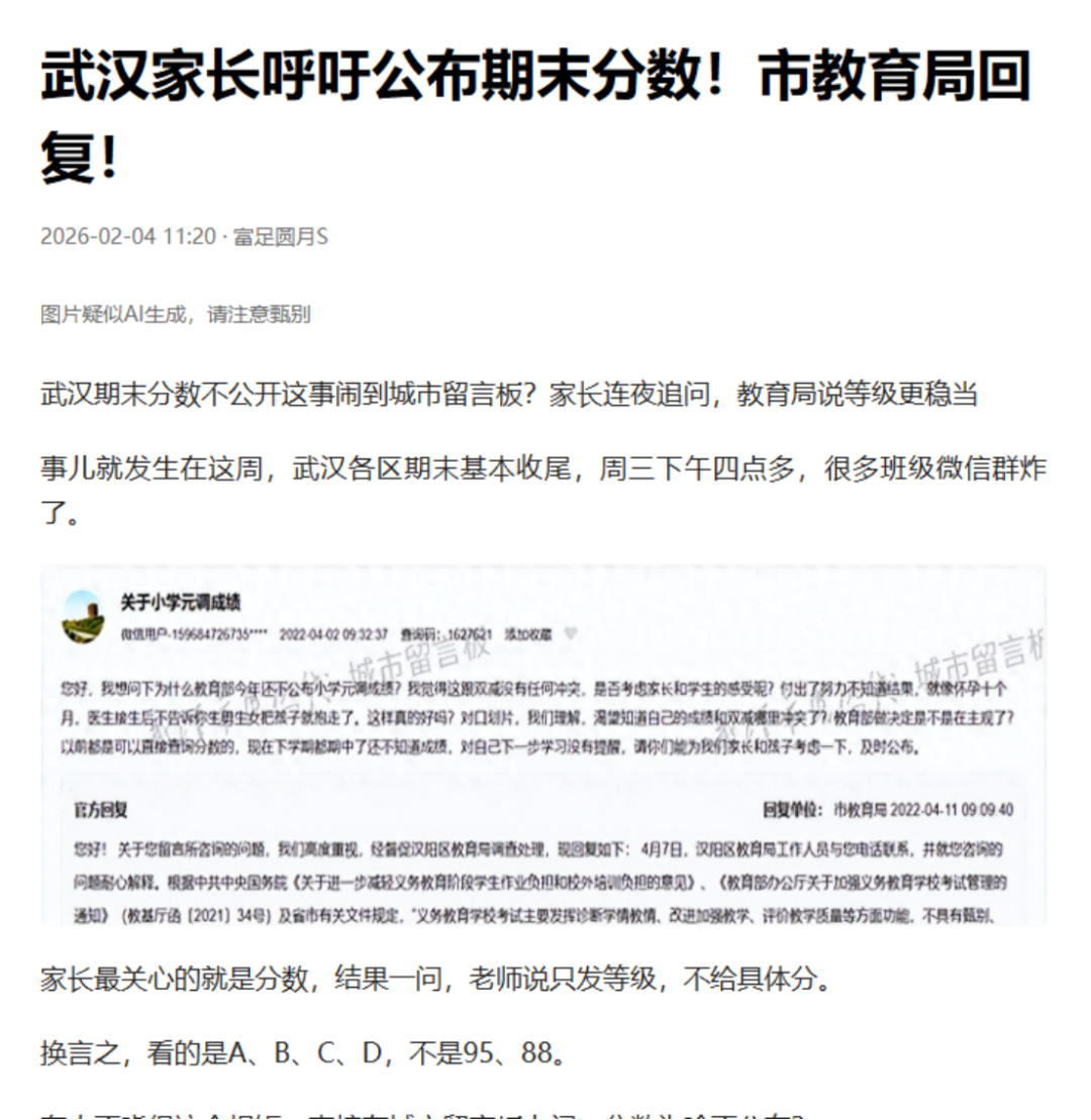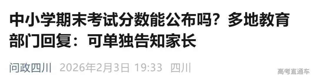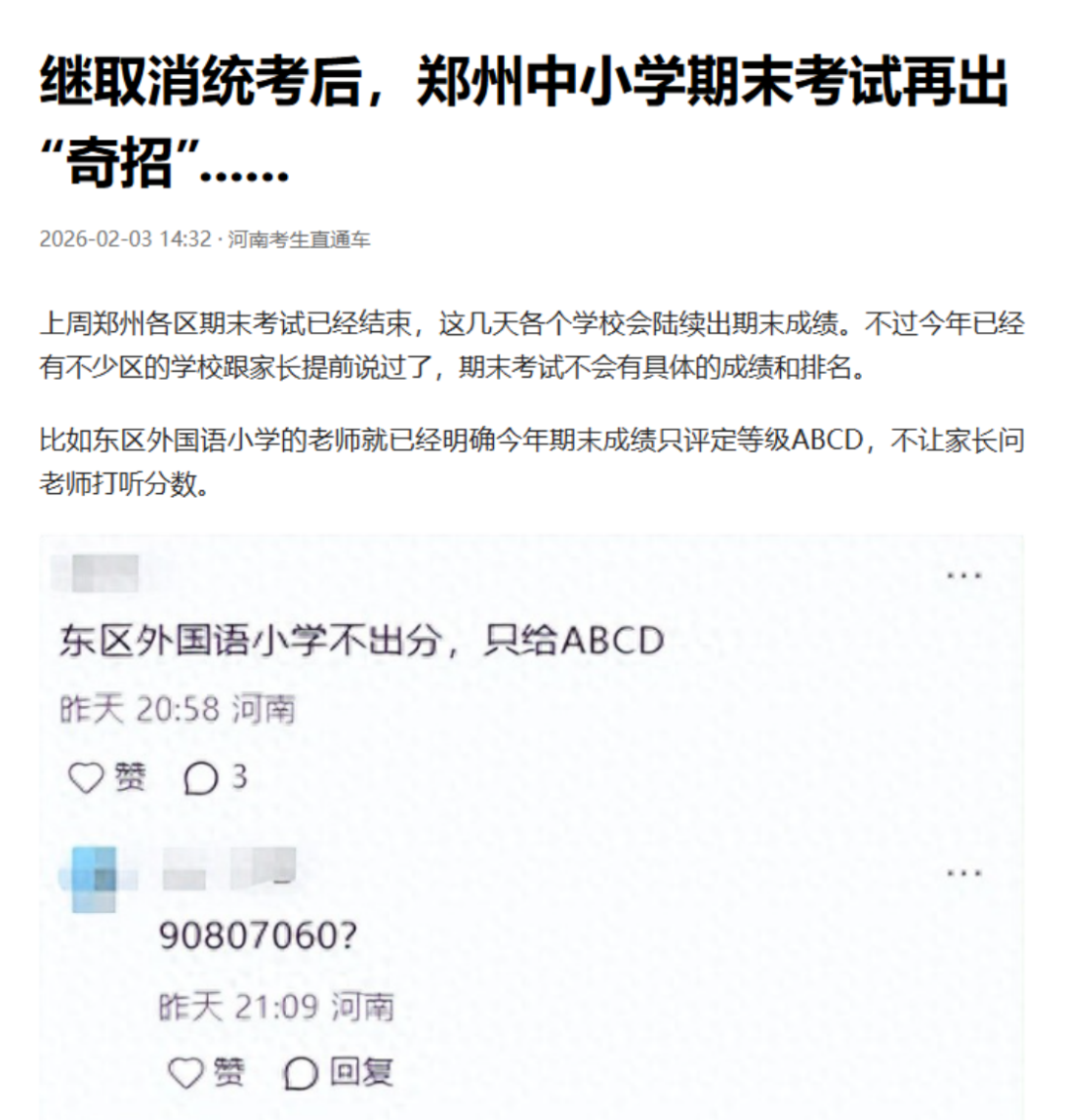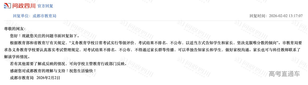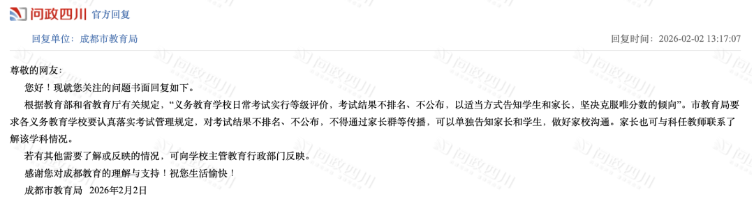 网络截图 国家政策: 义务教育实行等级评价 考试结果不排名、不公布 为何小学、初中期末考试的成绩只有等级没有分数,也没有排名? 这其实并非成都做法,而是源于国家层面的政策规定。 就最近来说,2025年12月4日,教育部印发《关于进一步加强中小学日常考试管理的通知》(以下简称《通知》),对中小学日常考试管理提出系统要求,旨在压减考试频次、提升考试质量、强化安全风险防范,切实减轻学生过重学业负担,促进学生全面健康发展。 《通知》对“中小学日常考试”作出了清晰界定,指地方和学校在日常教学过程中,为了检验学生阶段性学习效果、服务于教学改进而面向年级全体学生组织实施的考试,不含初高中学业水平考试和普通高等学校招生全国统一考试。 与此同时,《通知》从进一步压减考试频次、严格命题管理、强化审核把关、优化结果应用等七个方面提出了20项具体举措,覆盖了考试管理的全过程。 其中,在“进一步优化结果应用”方面,《通知》明确规定,义务教育学校日常考试实行等级评价,考试结果不排名、不公布,以适当方式告知学生和家长,坚决克服唯分数的倾向。树立正确的教育评价观,准确把握考试评价的诊断、改进功能,加强对学生增值表现、潜在能力、短板弱项等方面的分析诊断,推进教、学、评的有机统一,实现以评促教、以评促学,助力学生全面而有个性地发展。 这一规定也是各地教育主管部门回应当地家长类似诉求的主要政策依据。 值得注意的是,义务教育阶段淡化分数和排名并非新规。早在2017年12月印发的《义务教育学校管理标准》中就已经提出,“考试成绩不进行公开排名,不以分数作为评价学生的唯一标准。” 2021年3月,教育部等六部门印发《义务教育质量评价指南》,也提到“严控考试次数,不公布考试成绩和排名”;同年6月,《未成年人学校保护规定(征求意见稿)》再一次强调“不得公开学生个人的考试成绩、名次”。 成都做法: 不公开 但可单独告知 平衡学生保护与家长知情 实际上,“不公开分数排名,但可以单独告知家长和学生”这一做法,是一条保护学生心理健康与满足家长知情权的务实路径。 对此,成都市教科院中学教育研究所副所长、语文教研员黎丙成介绍,日常考试本质是检验教学效果、诊断学情、改进教学的工具,其结果不应简单等同于对学生学习状态、学习能力及学习效果的综合测评,也不应简单异化为竞争排名、强化压力的手段。 “分数与排名被简单等同于教育质量,容易导致教学过程逐渐偏离育人初心,陷入重复训练、机械刷题的恶性循环。” 他认为,将考试结果单独通知家长和学生,既能减少对学生心理造成的不必要干扰,又能让家长和学生把握学生阶段学习效果,结合多方面表现进行分析与提升。 黎丙成强调,分数只是评估学生阶段学习效果的维度之一,分数的高低并不能全面反映学生的学习能力。 “强调分数和进行横向比较,不仅无助于学生应对未来社会的复杂挑战,更可能削弱其核心素养的形成,不利于学生解决真实问题和创新创造能力的提升。同时,‘唯分数论’很大程度会影响学生只关注学习结果,而忽略在学习过程中自我学习能力的完善和提升。” 破解焦虑: “分数不是全部” 推动多元评价,强化家校共育 针对部分家长因不公开排名产生的焦虑情绪,黎丙成强调“分数不是全部”。 黎丙成认为,减少低效重复的考试与训练,不仅不会降低学业水平,反而能为学生深度思考与综合素养的发展开辟更广阔的空间。让考试真正服务于学生成长,让评价有效推动教学改进。 他建议学校从多方面进行引导:一是构建涵盖课堂参与、项目研究、实验操作、社会实践、艺术表现、体育锻炼等的多元综合评价体系,淡化结果导向的评价;二是将评价改革与课程教学改革深度融合,用更高质量的学习活动替代重复应试训练;三是通过家长会、家校沟通等渠道,传播科学的教育观与成才观,引导家长关注孩子的习惯、身心健康与综合发展。 成都市茶店子小学党委副书记、校长季志彬介绍了所在学校的做法:规范校内分数管理+分层反馈学情+精准对接家长的需求。 “学校分数不公开,但不隐藏,我们严禁以任何形式公开学生的分数以及排名。但对有个性化需求的家长,通过一对一保密方式告知家长,既落实政策,又满足家长的‘知底’的需求。同时引导家长不仅要知道孩子学得怎么样,更应该知道怎么去帮助孩子全面发展,精准实现家校共育。”