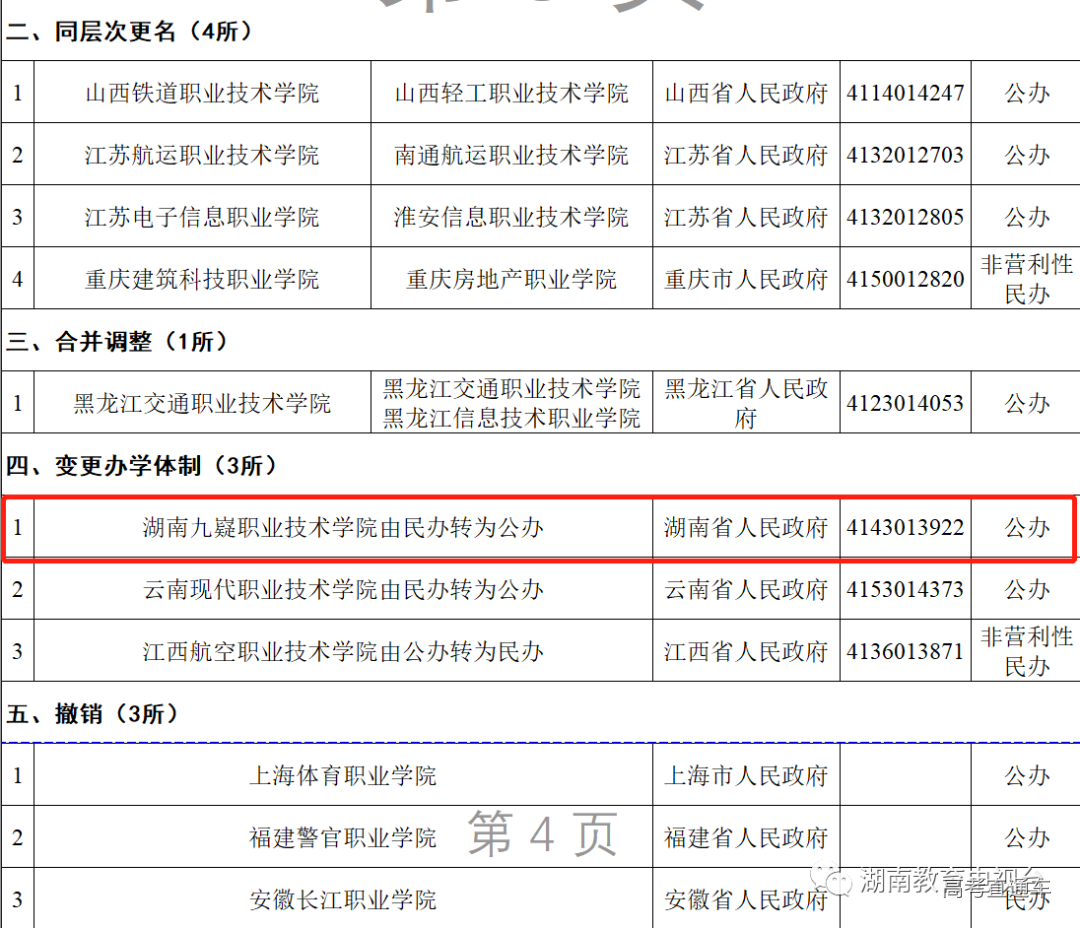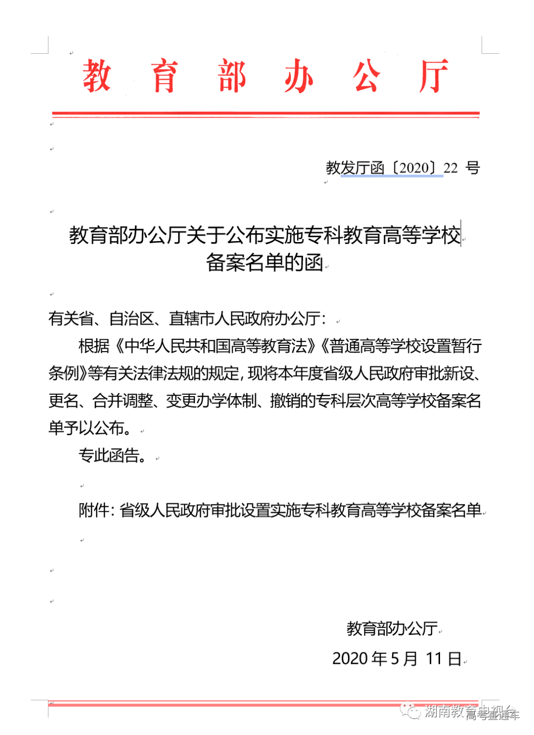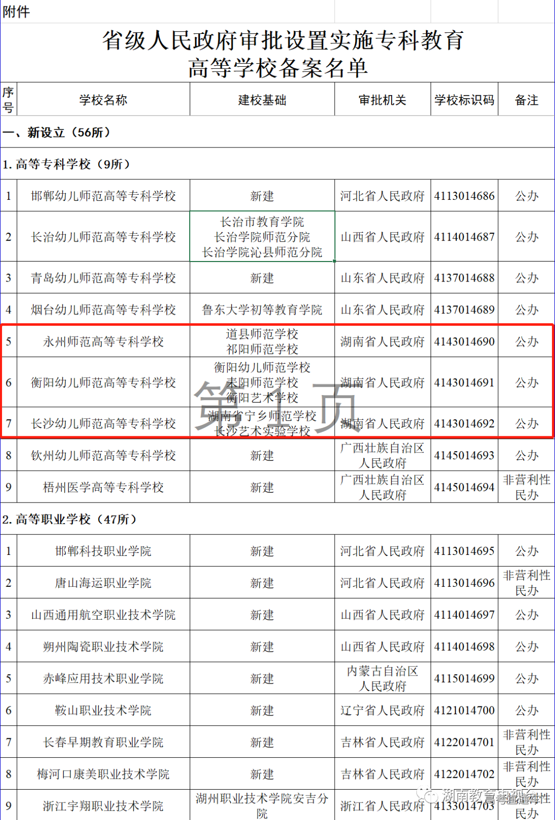 近日,《教育部办公厅关于公布实施专科教育高等学校备案名单的函》(教发厅函〔2020〕22号)公布本年度省级人民政府审批新设、更名、合并调整、变更办学体制、撤销的专科层次高等学校备案名单,我省四所学校榜上有名。 其中,新设三所师范类高等专科学校分别是:永州师范高等专科学校——以道县师范学校、祁阳师范学校为基础创建;衡阳幼儿师范高等专科学校——以衡阳幼儿师范学校、耒阳师范学校和衡阳艺术学校为基础创建;长沙幼儿师范高等专科学校——以湖南省宁乡师范学校和长沙艺术实验学校为基础创建。 变更办学体制的有一所,湖南九嶷职业技术学院由民办转为公办。