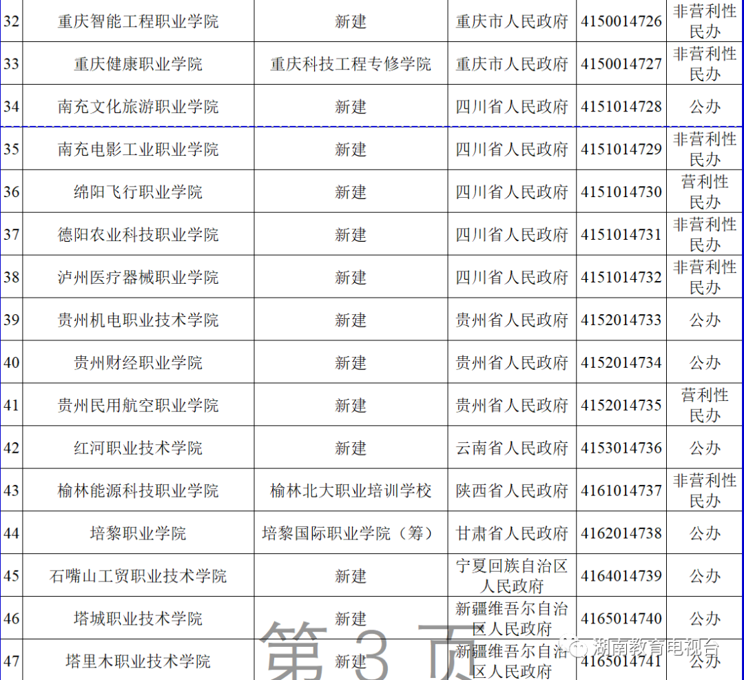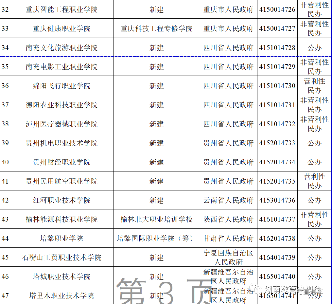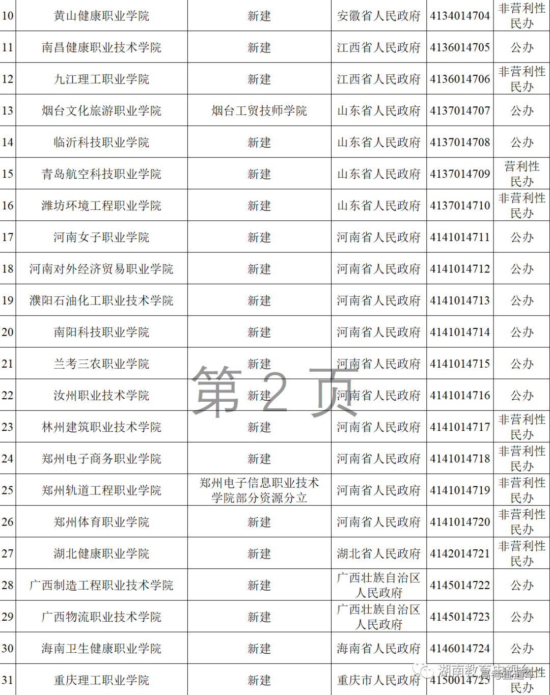 近日,《教育部办公厅关于公布实施专科教育高等学校备案名单的函》(教发厅函〔2020〕22号)公布本年度省级人民政府审批新设、更名、合并调整、变更办学体制、撤销的专科层次高等学校备案名单,我省四所学校榜上有名。 其中,新设三所师范类高等专科学校分别是:永州师范高等专科学校——以道县师范学校、祁阳师范学校为基础创建;衡阳幼儿师范高等专科学校——以衡阳幼儿师范学校、耒阳师范学校和衡阳艺术学校为基础创建;长沙幼儿师范高等专科学校——以湖南省宁乡师范学校和长沙艺术实验学校为基础创建。 变更办学体制的有一所,湖南九嶷职业技术学院由民办转为公办。