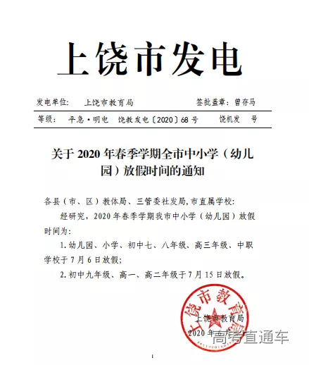 根据省教育厅通知要求,综合考虑全市疫情防控和线上学习情况,经研究,确定我市中小学(幼儿园)2020年春季学期放假时间为:
