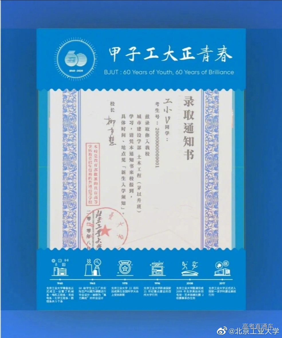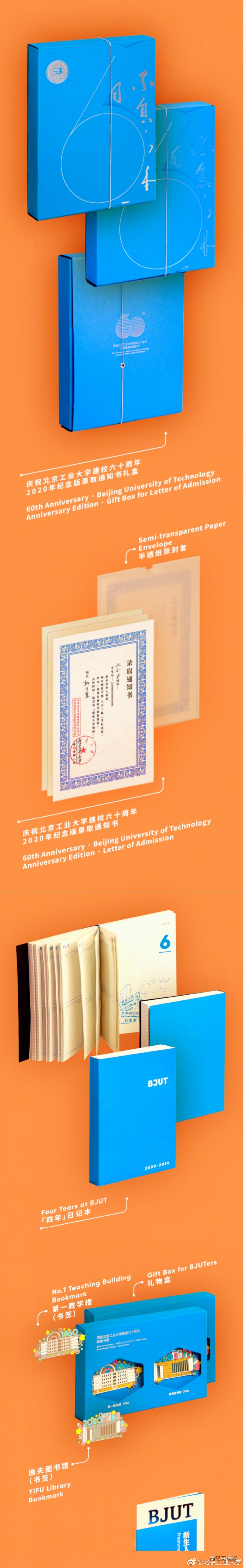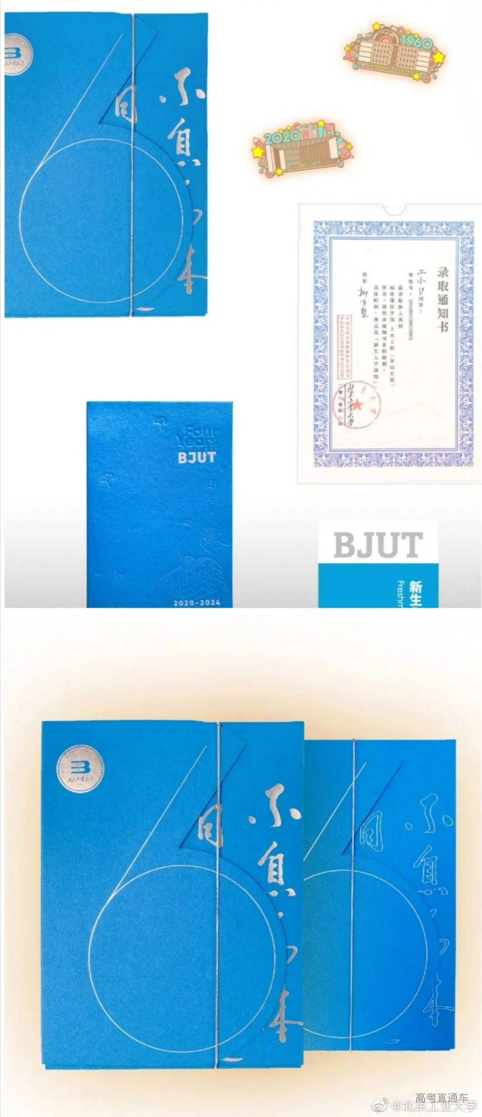传承用心对待每一位学生、用心关爱每一位学生的理念,北京工业大学2020年本科录取通知书在“甲子工大正青春”庆祝建校60周年纪念版的设计中,融入校庆元素,结合学生喜好,希望每一位新生在开启人生新阶段的同时,能够喜欢这一份珍藏一生的心意礼盒。