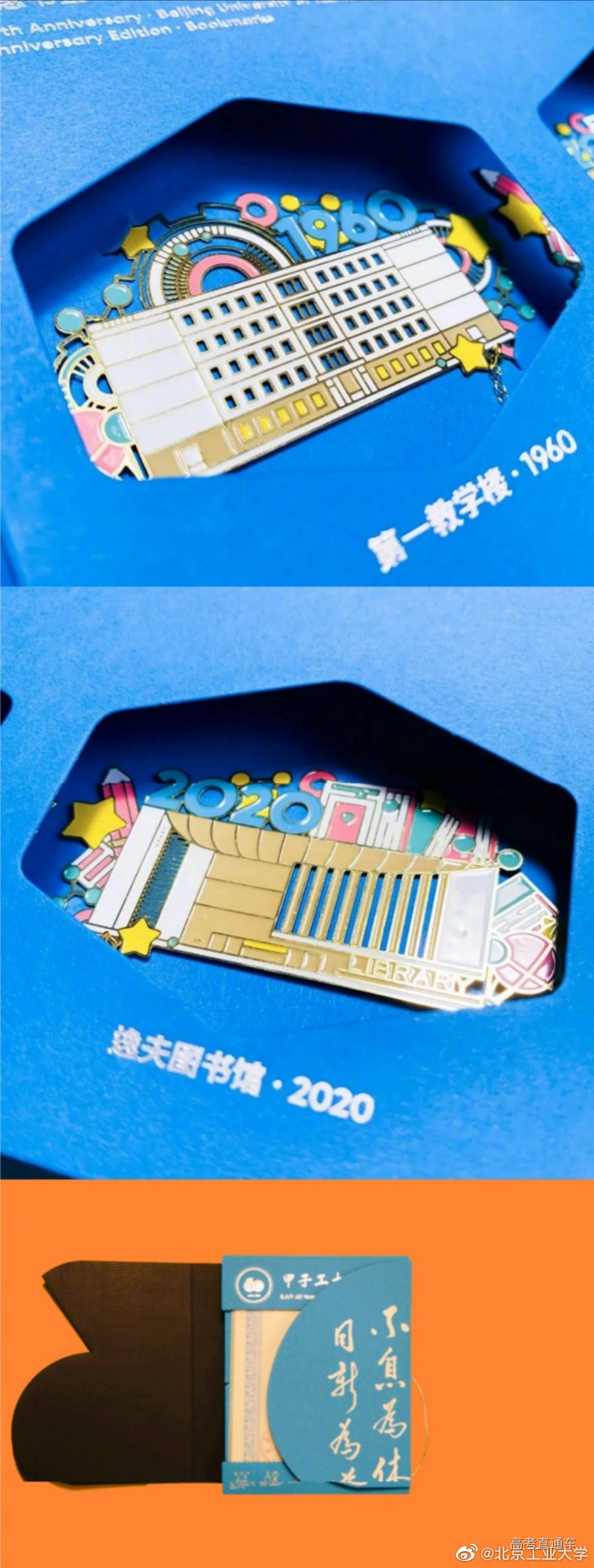 六十周年校庆纪念珐琅书签则由1960年的第一教学楼和2020年的逸夫图书馆缩影而成。这是工大初见世界的印象,也是工大发展至今的模样。