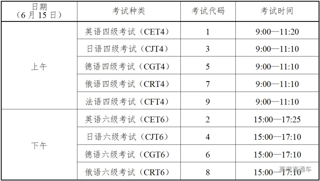 CET考试时间为6月15日;开考科目为英语、日语、德语和俄语4个语种的四级和六级,法语四级。