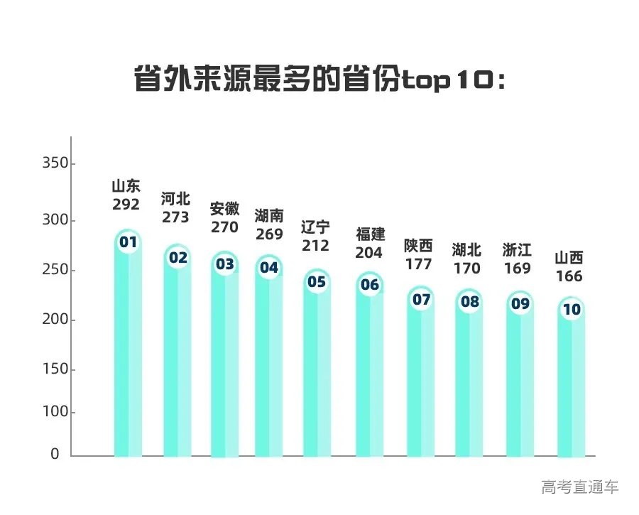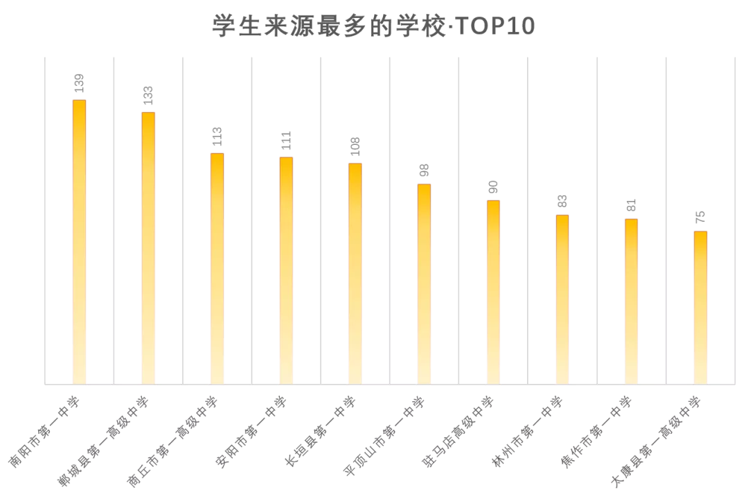 20级学生生源来源top10分别是南阳市第一中学、郸城县第一高级中学、商丘市第一高级中学、安阳市第一中学、长垣县第一中学、平顶山市第一中学、驻马店高级中学、林州市第一中学、太康县第一高级中学。你的母校有没有榜上有名呢?