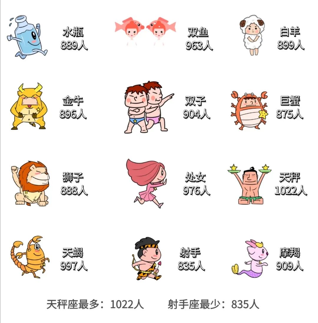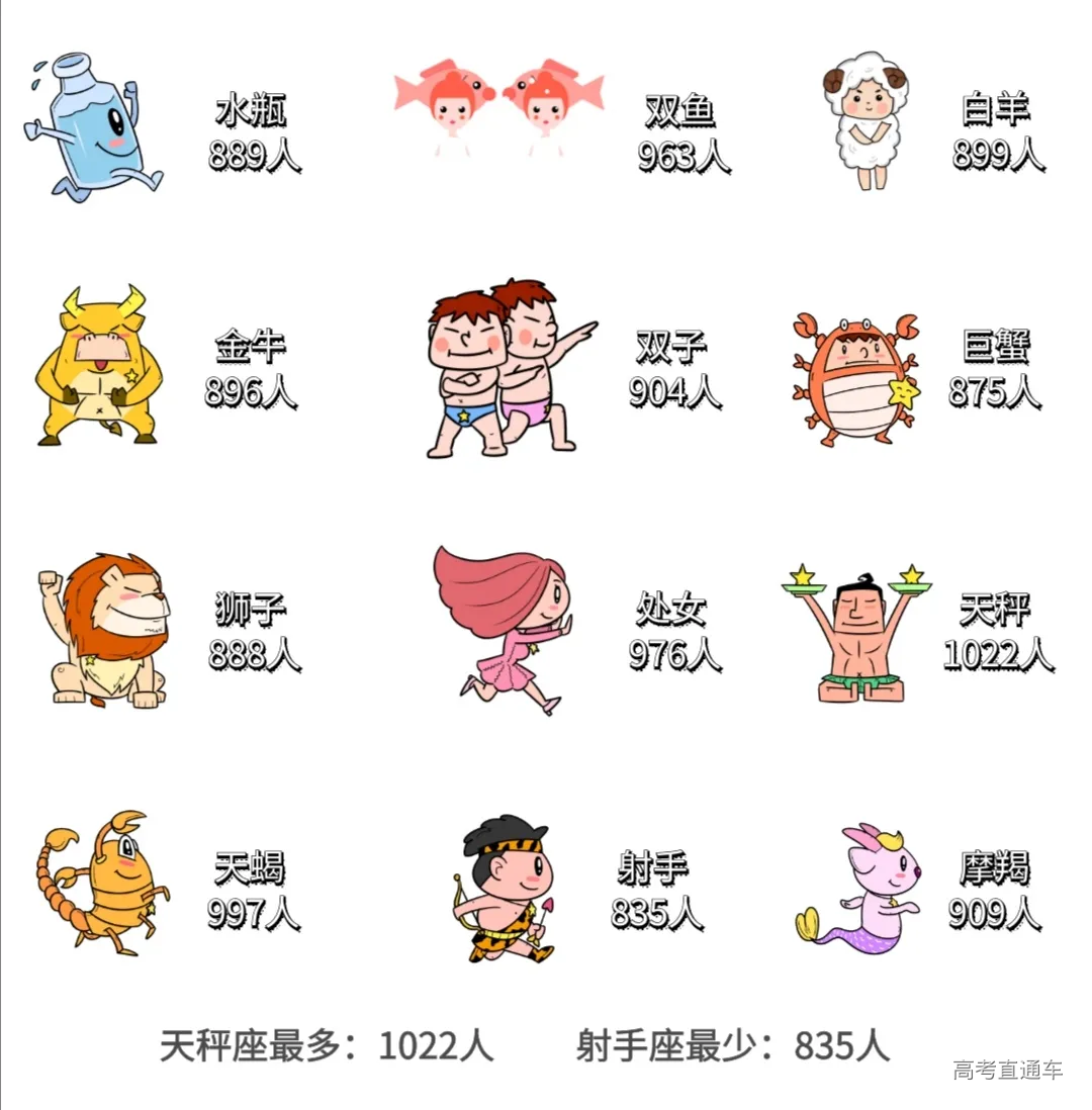 多热烈的白羊,多温柔的巨蟹~青春里总有一个话题属于星座,你是什么星座呢?数据显示,新生中天秤座人数最多,射手座人数最少。你喜欢的星座是什么呢?一起留言互动起来吧~