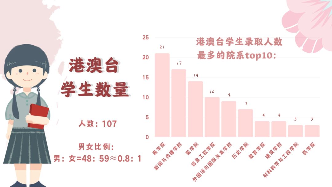2020年共计录取港澳台学生107人,男女比例为0.8:1。录取人数最多院系top3分别是商学院、新闻与传播学院、医学院。港澳台萌新们,和小编一起感受中原的魅力吧~