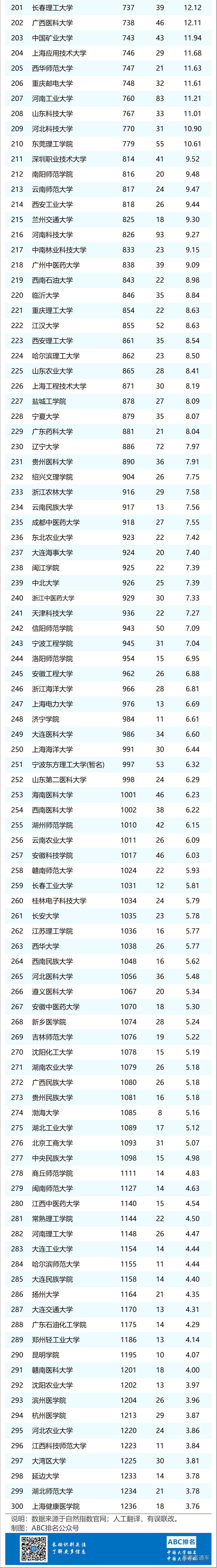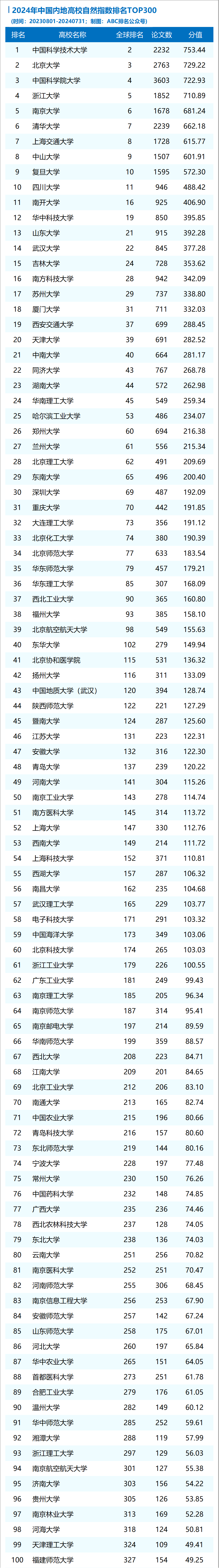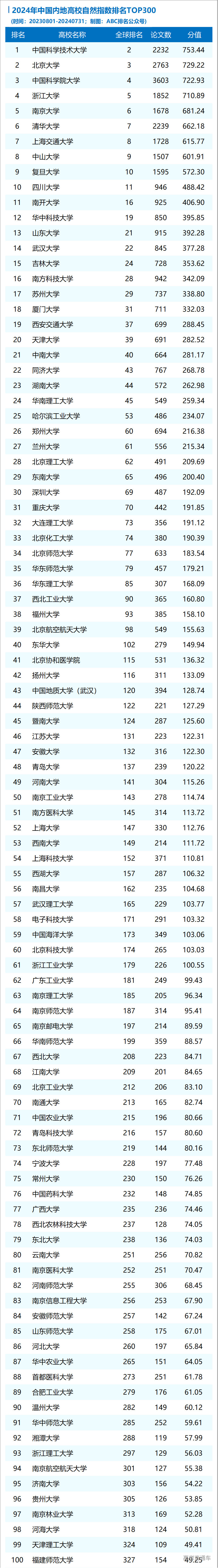 2024年最新自然指数中国内地高校排名TOP300如下。