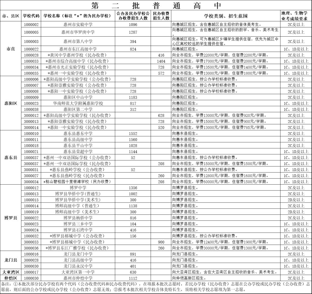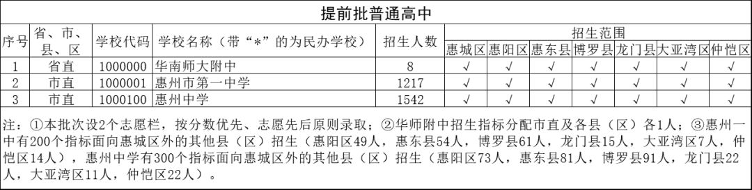 2019年全市普通高中学校共设四个志愿批次:体育、艺术项目专项招生普通高中(1个志愿栏),提前批普通高中(2个志愿栏),第一批普通高中(4个志愿栏),第二批普通高中(4个志愿栏)。各批次按照体育、艺术项目专项招生普通高中→提前批普通高中→第一批普通高中→第二批普通高中顺序录取。被前面批次普通高中学校录取的考生不再参与后面批次普通高中学校的录取。各批次招生学校及招生范围参见《2019年惠州市普通高中各批次学校及招生范围》。