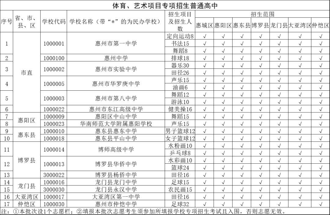 根据《关于在2019年全市高中阶段学校招生录取工作中开展有关改革试点的通知》(惠市教〔2019〕47号),为鼓励普通高中学校特色办学、创新发展、品牌塑造,2019年起,在全市范围内探索实施体育、艺术项目专项招生,打造较高专业水平和影响力的学生体育、艺术团队,代表我市参加全省、全国乃至国际各级各类体育、艺术展演、赛事和交流活动。一所普通高中学校可有1-2项体育或艺术专项在全市招生,每专项确定在2-3所普通高中学校开设。经各县(区)教育局推荐与市直学校申报,我局对全市申报体育、艺术项目专项招生的普通高中学校进行了材料审核和实地评估,确定惠州市第一中学等16所学校为2019年惠州市体育、艺术项目专项招生试点学校。具体试点学校及项目名单参见《2019年惠州市普通高中各批次学校及招生范围》。