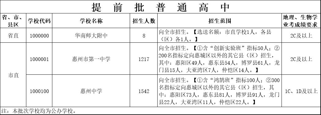 (一)根据《关于在2019年全市高中阶段学校招生录取工作中开展有关改革试点的通知》(惠市教〔2019〕47号),2019年,除部分市直普通高中学校在全市招生外,全市各县(区)可各推荐1所公办普通高中学校(省一级及以上学校)设定部分招生指标在全市招生。经各县(区)教育局推荐,在全市招生的公办普通高中学校及招生指标如下:惠阳中山中学(50人)、惠东中学(100人)、博罗中学(100人)、龙门中学(50人)、大亚湾第一中学(30人)。